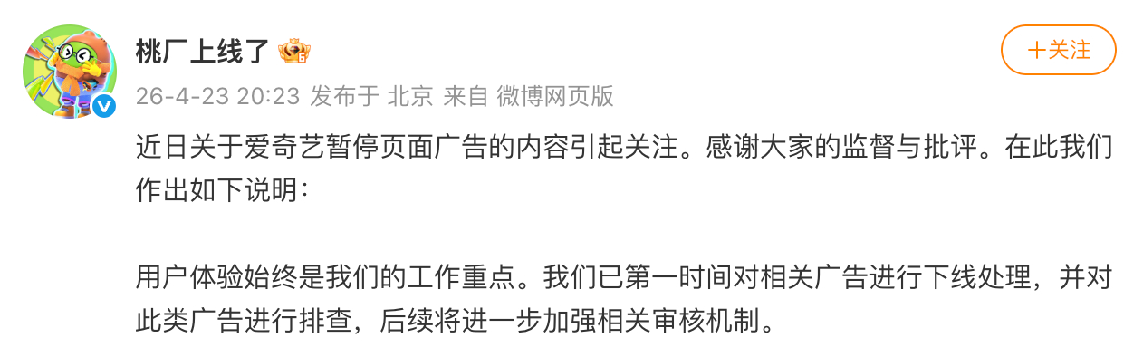 爱奇艺回应暂停页面广告争议