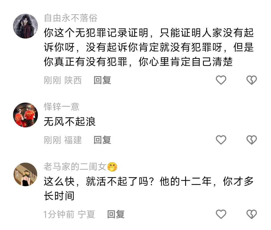 范世錡公布【无犯罪记录证明】,并起诉部分造谣者 对此,网友表示,这能说明什么呢? 这种证明,只能说明范世錡没有曾经因为犯法被定罪过,而不能证明他没有做过任何违法犯罪行为,因为不是每一个案件都是立刻被查明真相的。 简单来说,这个证明还是解答不了大家的疑问。 网友评论:你这个无犯罪记录证明,只能证明人家没有起诉你呀,没有起诉你肯定就没有犯罪呀…… 范世琦