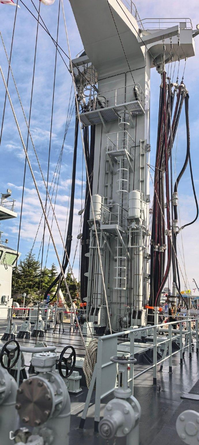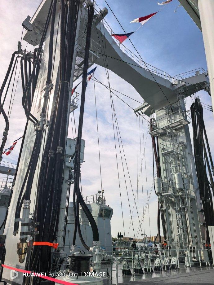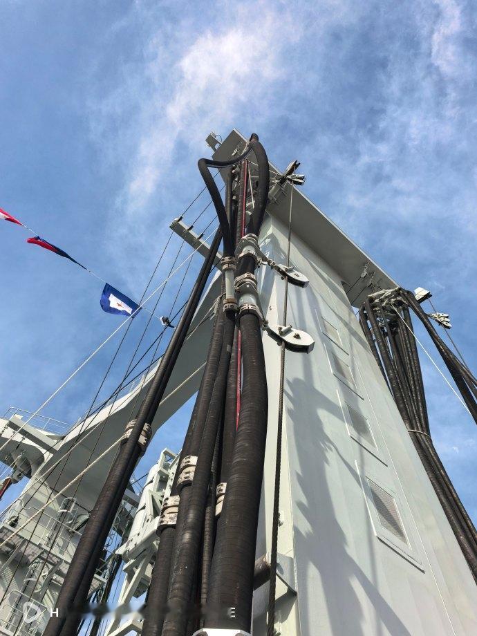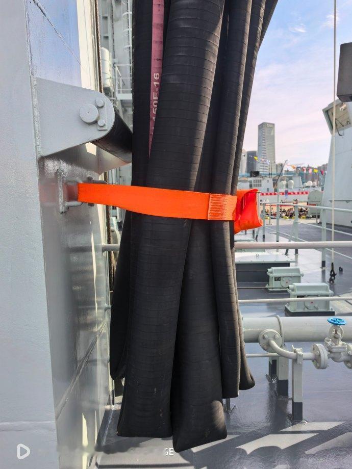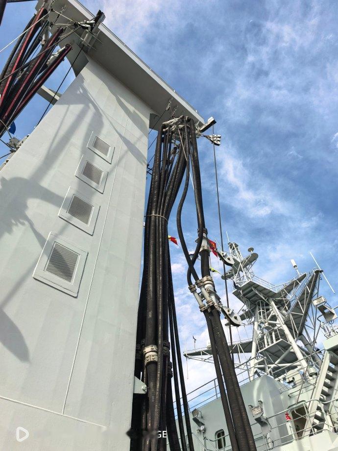 902“东平湖”舰液货补给门架,位于舰体舯部靠前位置,是双站双向、四管路并行补给站。采用桁架式钢结构门架,整体高度约15-18米,单座门架集成两套独立高架索补给站(左/右站)。 图中黑色的就是输油水管路软管,材质为复合橡胶内置钢丝增强。每套补给站配置4根独立软管,分三类液货,管径与流速严格匹配: 最粗的150mm软管为加注舰用柴油/重油用,单站最大输送速率约300吨/小时; 中等粗的100mm软管为加注航空燃油用,单站速率约150吨/小时; 最细的75mm软管为加水用,单站速率约200吨/小时; 图1那个金黄色的探头就是高架索液货补给探头,挂在高架索滑车下方,和受补舰的受油/受水口对接