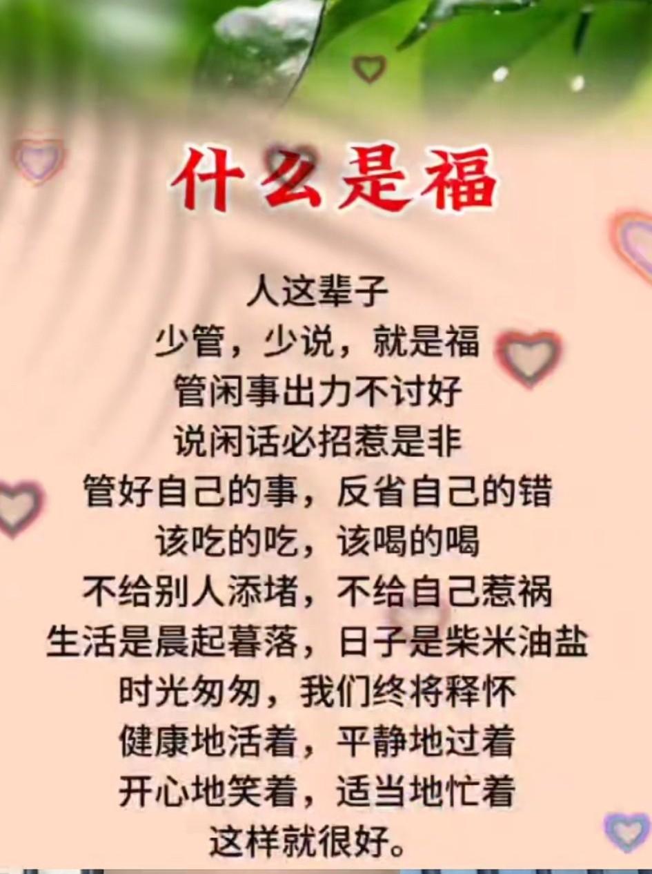 人生有三福: 健康是福, 平安是福, 吃亏是福。 若能修好这“三福”, 你一辈子都会很快乐, 很幸运,很幸福!