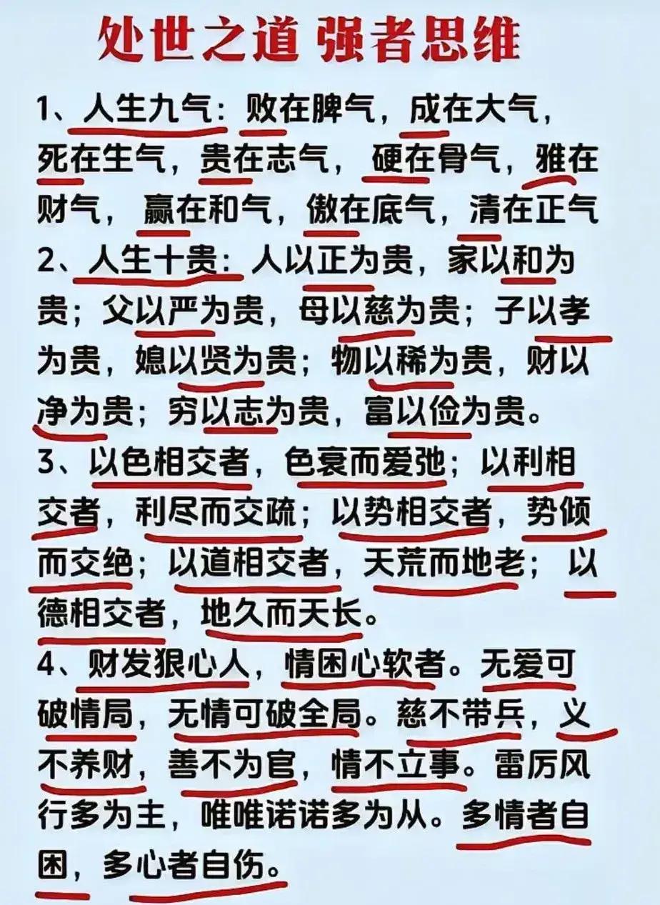 为人处事之道 · 10条狠人话,句句直戳心窝 1. 会装傻 事情看破不说破,学会看穿不拆穿。 虽然心里门儿清,但是嘴上装糊涂。 会装傻,才是最高级的自保。 2. 会做人 既不得罪人,也不树敌人。 凡事面上过得去,但是心里有距离。 要做到不得罪人,就是少给自己挖坑。 3. 会说话 有时不说真话,只说好听的话。 学会顺人情绪,要给人面子。 嘴巴甜的人,走到哪都不吃亏,毕竟伸手不打笑脸人。 4. 会来事 要懂得察言观色,学会揣摩人心。 话没说出口,事就办到位,办事要比说话在前。 要懂得人心,懂人心比懂道理管用一万倍。 5. 会画饼 不轻易兑现,但要常给希望。 用期待拴住人,用远景稳住人,用实际留住人 会画饼,才能驾驭人心。 6. 有分寸 说话要留三分软,做事要到五分止。 不越界,不揭短,不逼人。 做人要有分寸感,就是成年人最高级的教养。 7. 通人性 要学会不跟人性较劲,不跟人心较真。 见人说人话,见鬼不说话。 学会懂得人性,你就赢了大多数人。 8. 干事情 做人做事可以圆滑,但不能无能。 要学会手里有活,心中有底。 自身实力过硬,才是你最硬的后台。 9. 下手狠 该出手时不留情,该断时不心软。 对敌人仁慈,就是对自己残忍。 心不狠,站不稳,该狠时就得狠。 10. 有城府 喜怒不形于色,心事不挂嘴边。 谋定而后动,藏锋才露芒。 有城府的人,最能成大事。