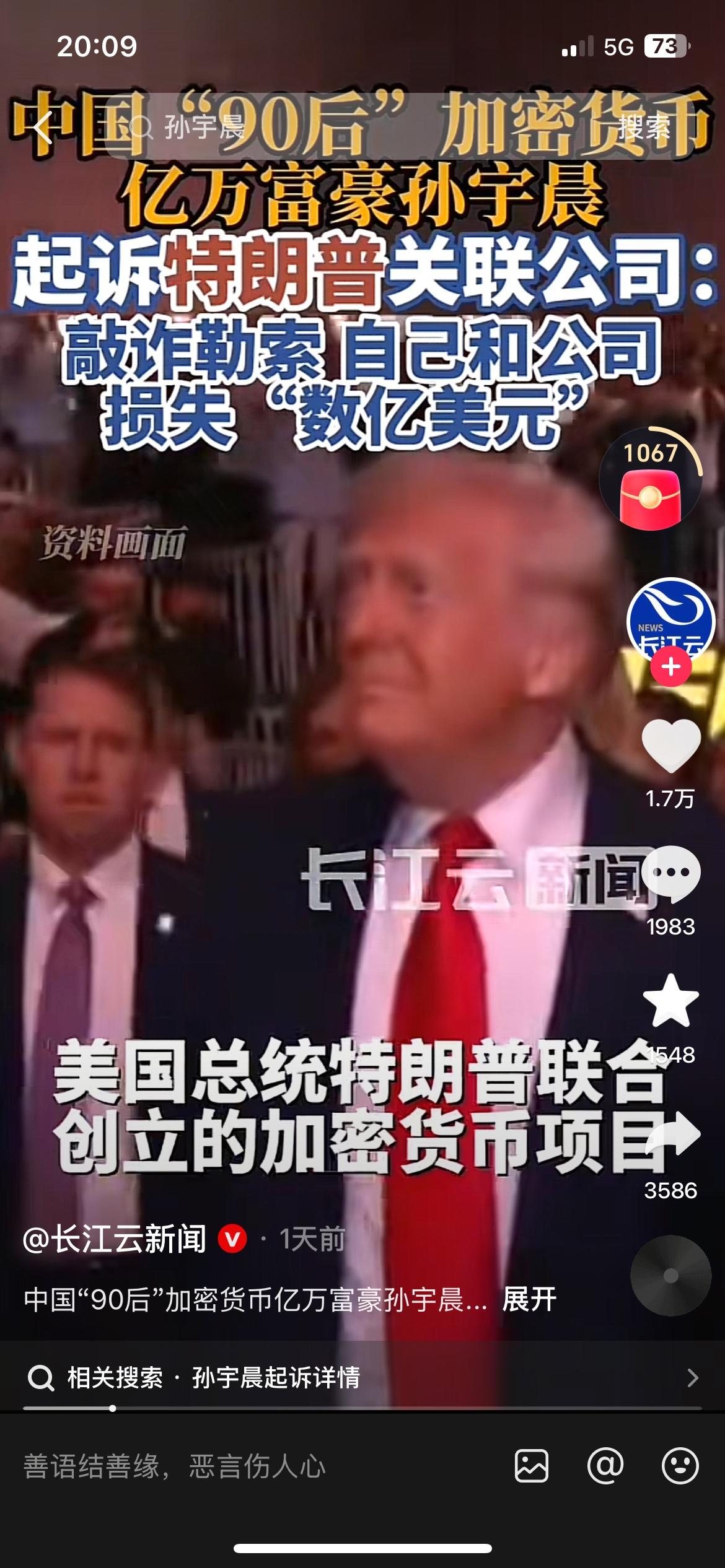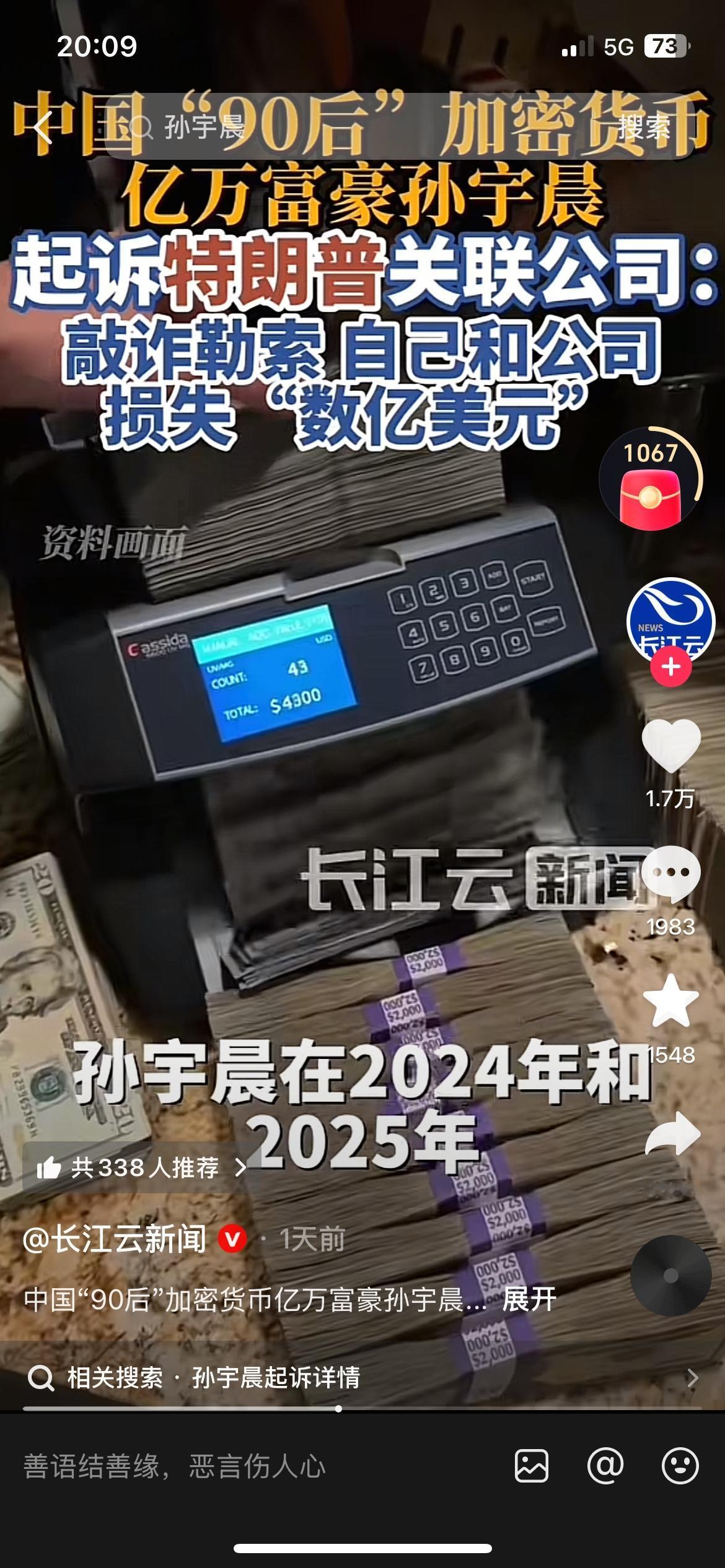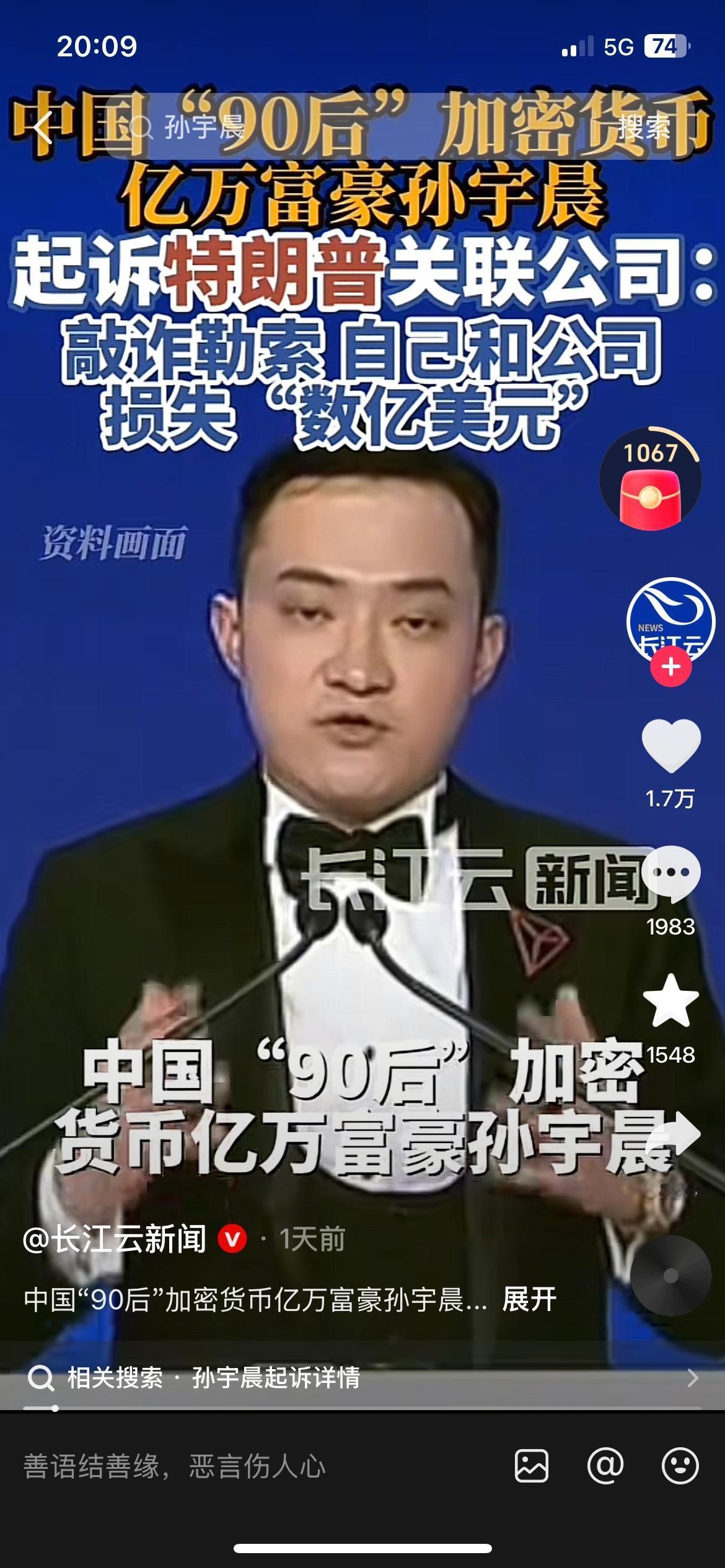 90后币圈富豪起诉特朗普关联公司,风波越闹越大 币圈又出大瓜,还是跨国大戏。 中国90后加密货币富豪孙宇晨,起诉特朗普关联公司敲诈勒索,称自己损失数亿美元。 对方被指冻结代币、阻挠出售,还牵扯大量代币纠纷。 币圈本身风险就高,再沾上海外政治项目,更是步步惊心。 你觉得这事儿最后会是什么结果? 孙宇晨 加密货币