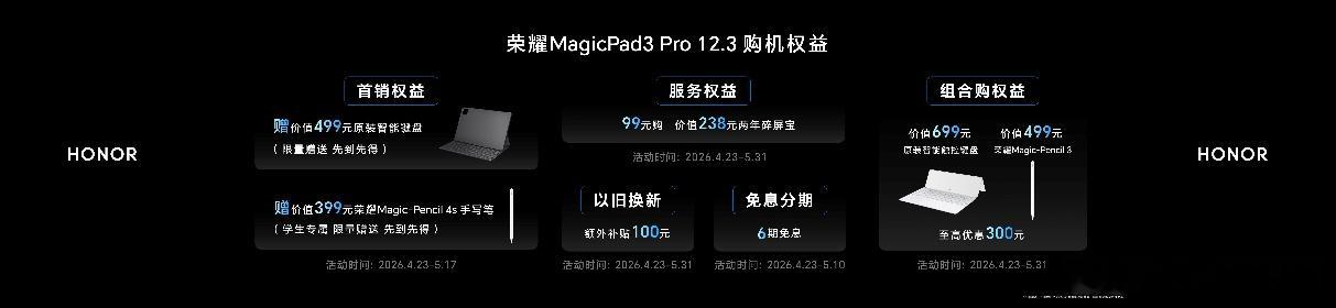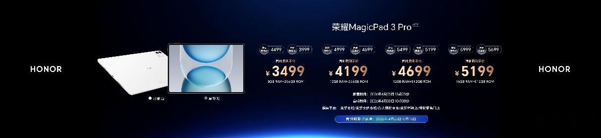 4月23日,荣耀在成都举办“荣耀WIN游戏本暨全场景新品发布会”,推出多款平板、笔记本和游戏本产品。其中,荣耀MagicPad3 Pro 12.3作为2026年旗舰平板正式发布。荣耀MagicPad3 Pro 12.3机身厚度为4.8mm,重量约450g,是目前全球最薄的旗舰平板之一,比iPad Pro 13更薄。它采用航天级纤维材料和高强铝一体化锻造工艺,搭配黄金微弧过渡设计。屏幕采用12.3英寸3K 165Hz Hybrid OLED面板,边框宽度3.9mm,峰值亮度3000nits,支持5280Hz高频PWM调光,并搭载芯片级AI离焦护眼和DOT护眼技术等多项护眼功能。性能上,该平板搭载第五代高通骁龙8旗舰芯片,配合荣耀冰封散热架构。内置10100mAh电池,支持66W超级快充和27W反向充电。网络方面支持双Wi-Fi 7,音频系统为八扬声器+第三代空间音频。该产品最大的特点是行业首创Linux与安卓双系统,支持“龙虾”端侧大模型部署,并通过文件系统隔离实现双系统独立运行和安全分离。MagicOS 10系统强化了PC模式,连接智能键盘后可实现多窗口调度和PC级桌面交互,内置剪映专业版、WPS、CAJ、东方财富等PC级应用,支持荣耀Magic-Pencil系列触控笔。此外,荣耀MagicPad3 Pro 12.3支持全品牌跨生态互联,可与苹果、安卓设备实现文件互传。目前已在荣耀商城及各大渠道开售,国补优惠价3499元起。4月23日至5月17日购买可享原装智能键盘赠送等活动。发布会上还发布了荣耀WIN系列旗舰游戏本、MagicBook Pro 2026轻薄本、X Plus系列笔记本等产品。曾在亦庄人形机器人半程马拉松中夺冠的荣耀机器人“闪电”以及与荣耀战略合作的张雪机车也亮相现场。此次发布会是荣耀4月全场景新品集中爆发的一部分,覆盖平板、轻薄本、游戏本等多个品类。荣耀表示,将继续基于阿尔法战略推进全场景AI终端生态建设。