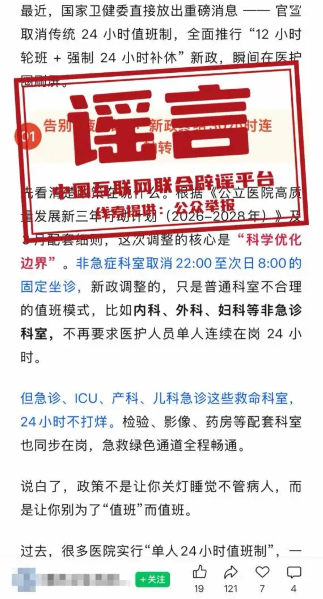 🚨 紧急辟谣:5月1日起医院取消24小时值班?假的! 最近朋友圈疯传的“5月1日起全国二级以上公立医院取消24小时值班”,经新华社、国家卫健委等多方核实,纯属谣言!大家千万别被带了节奏。 ❌ 谣言是怎么来的? 网传消息漏洞百出,全是张冠李戴: - 文件造假:传言中提到的《公立医院高质量发展新三年行动计划(2026-2028年)》配套细则,根本不存在。 - 文号错位:传言引用的文件文号“国卫办医政函〔2026〕63号”,实际是关于“医疗质量安全”的通知,和值班制度毫无关系。 🏥 真相是什么? - 急诊照常:根据《急诊科建设与管理指南》,急诊科必须24小时开放。五一后晚上突发急病,医院依然有人救。 - 排班优化≠取消值班:所谓的“取消值守”其实是对个别医院“备班制”的误读(即医生在家待命,有事呼叫),这并非国家统一政策,急危重症救治通道24小时畅通无阻。 💡 就医提醒 目前各地公立医院均正常运行,急诊、ICU、发热门诊等关键岗位均保持24小时值守,节假日无休。请大家以官方发布为准,勿信小道消息。 转发周知:夜班医生依然在岗,生命通道从未关闭。遇到此类消息,先查官方通报,别让谣言制造焦虑。
