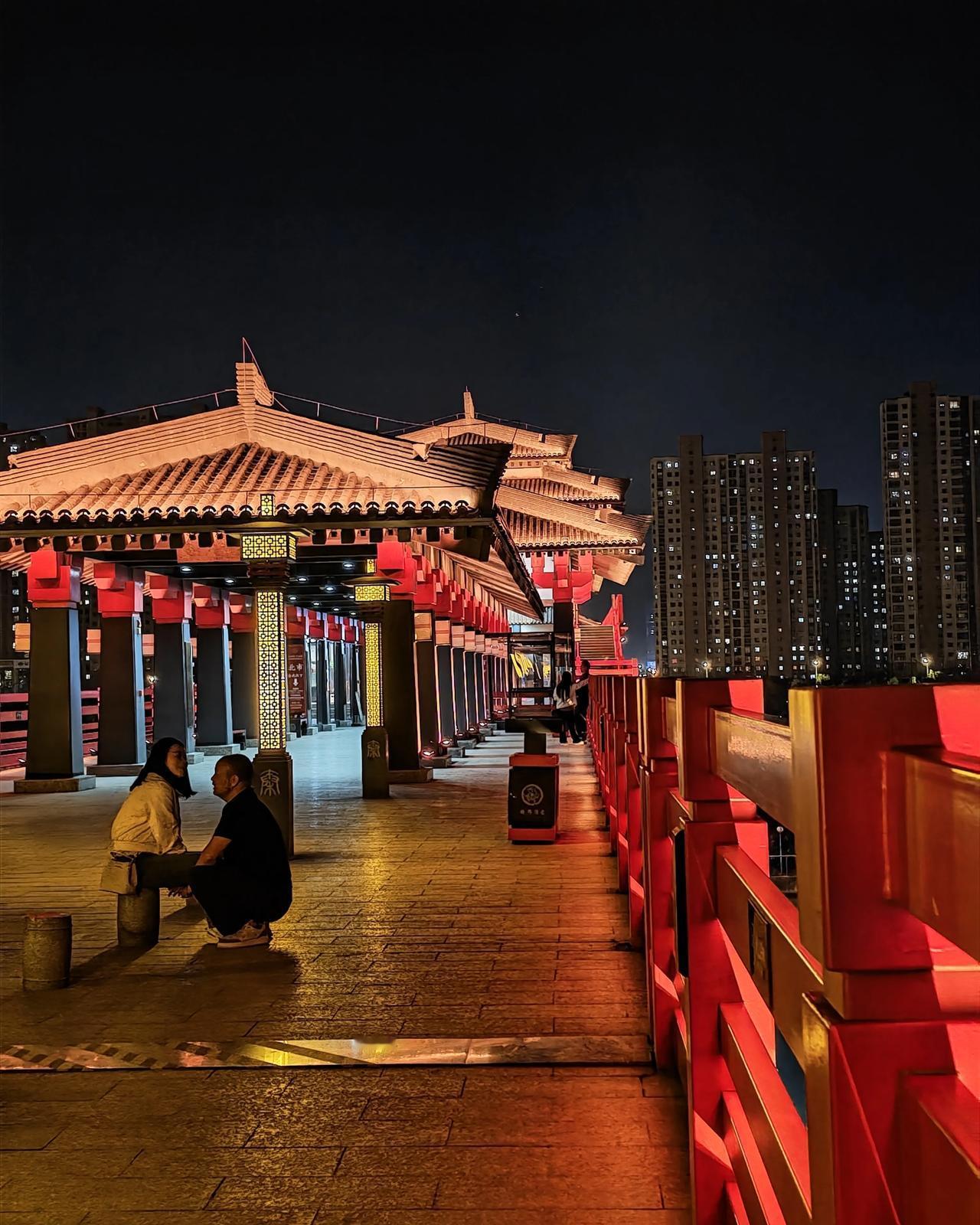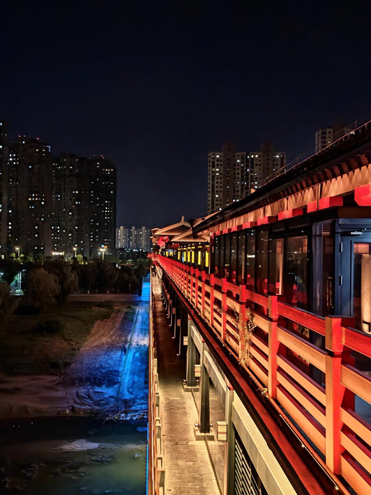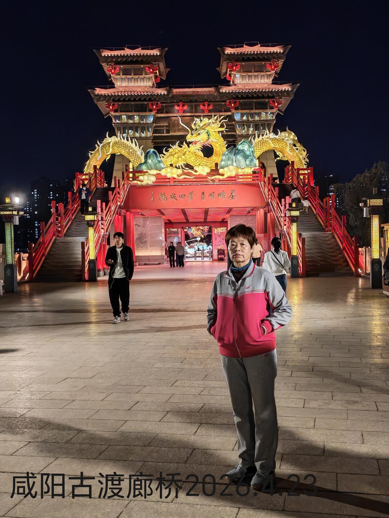 2026.4.23 星期四 昨晚在宝鸡看石鼓廊桥,今晚已漫步在咸阳古渡廊桥。两市廊桥都分别是两市的地标性建筑,都连接着商业区,连接着古文化,她们各有特色,但咸阳古渡廊桥更大气,更显雄壮。 咸阳古渡廊桥是全国首座秦建筑风格双层人行景观廊桥,名字源自关中八景之一的“咸阳古渡”。廊桥两端矗立象征秦定都咸阳的“冀阙”门,整体以朱红为主色调,融合廊、亭、坊等秦代建筑元素,尽显秦风古韵。桥面分上下两层:一层为市民徒步通行区,青石板铺路,北端设有20尊秦代历史人物青铜雕塑;二层是休闲观景平台,建有主阁“秦风阁”、副阁“天籁阁”“润心阁”,配套音乐厅、画廊、书吧等文化设施,可俯瞰渭河风光、远眺咸阳城景。 它与清渭楼、咸阳古渡遗址博物馆、渭河古渡遗址联动,构成咸阳古渡文化景观带,既是市民休闲步道,也是感受秦汉历史、观赏渭河夜景的热门打卡地。