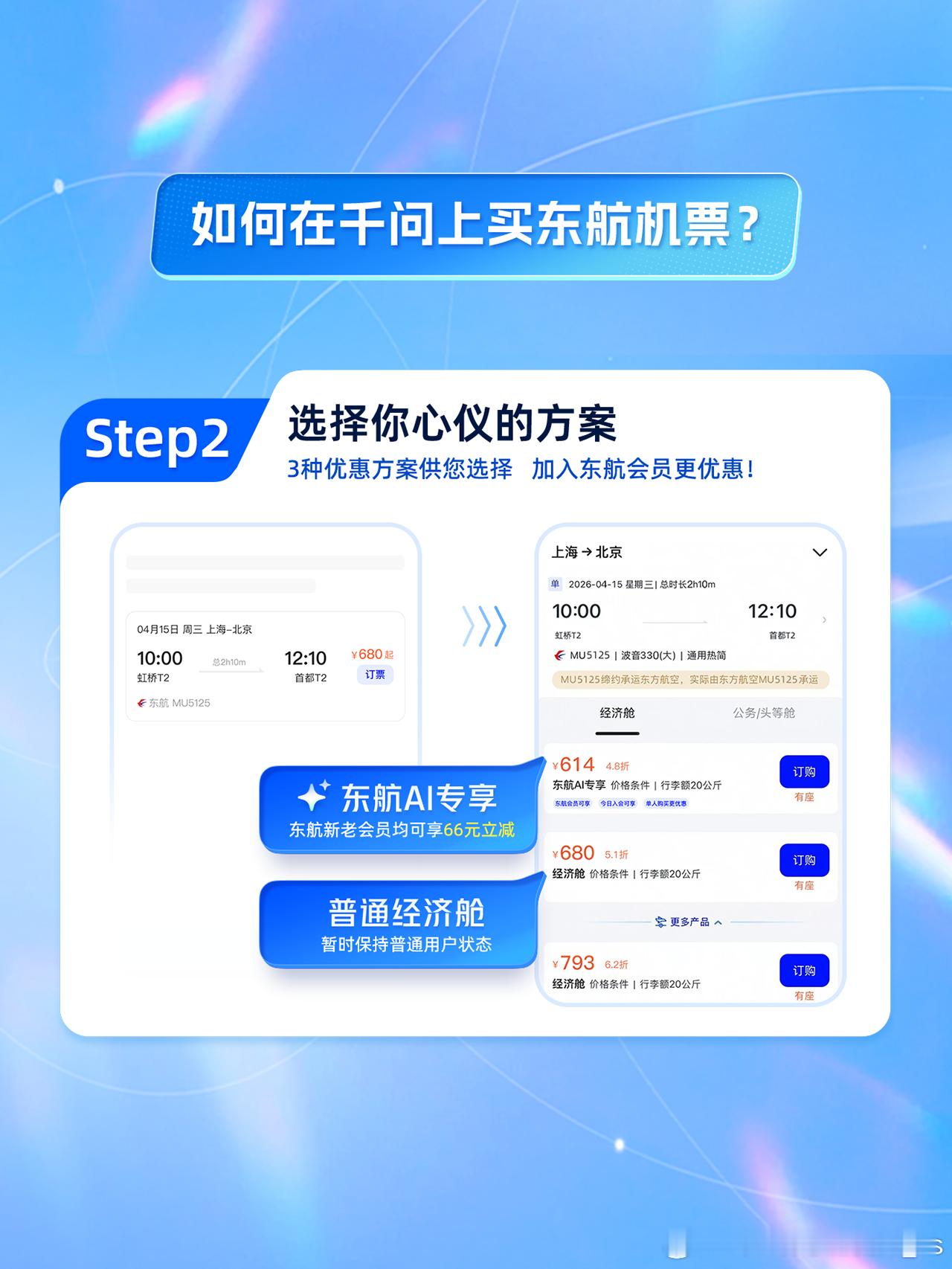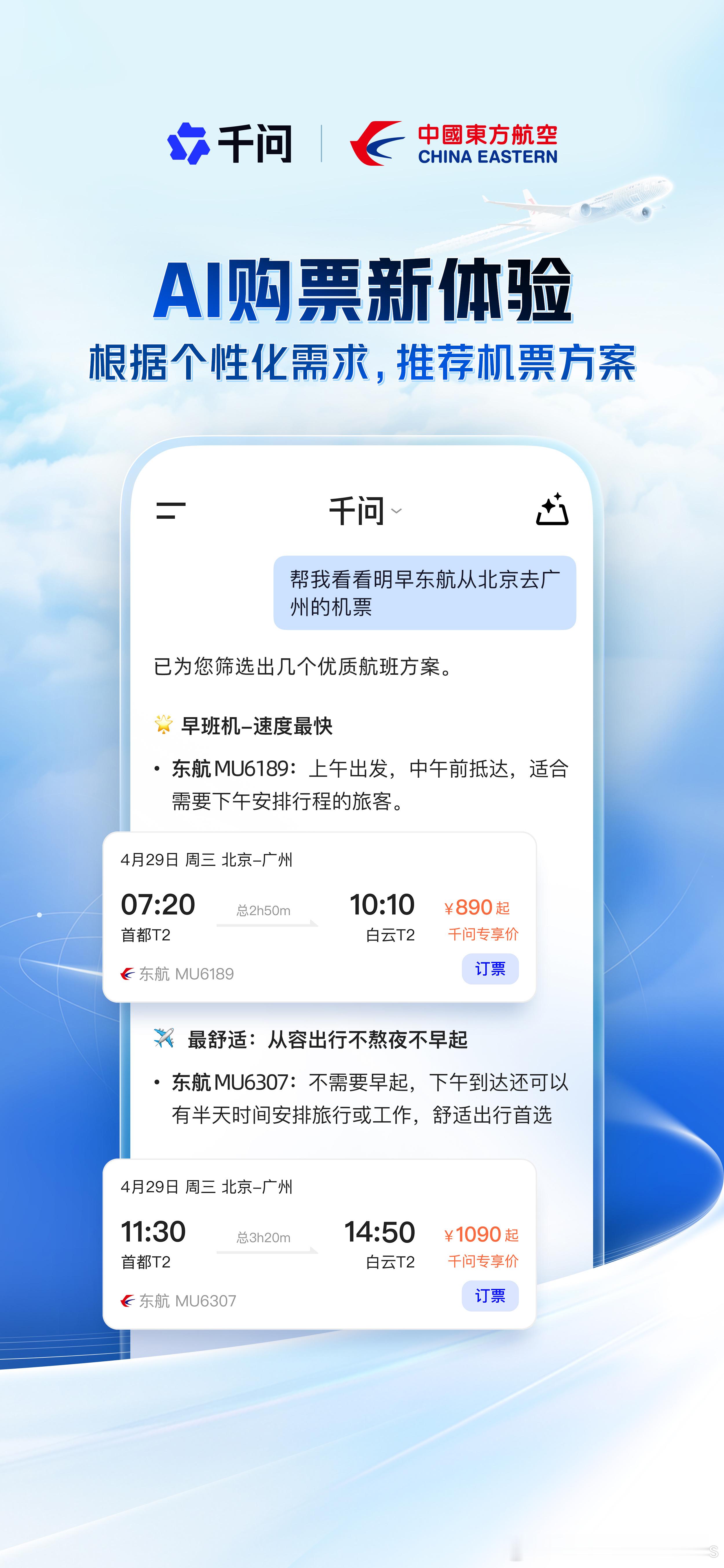 别让订票毁了出行好心情!用千问AI订机票真的很智能 情侣意见不合?千问帮你统一东航航班信息,价格、时间、会员权益全兼顾,6月30日前下单还能省,看一轮就定好,再也不用为订票吵架啦~