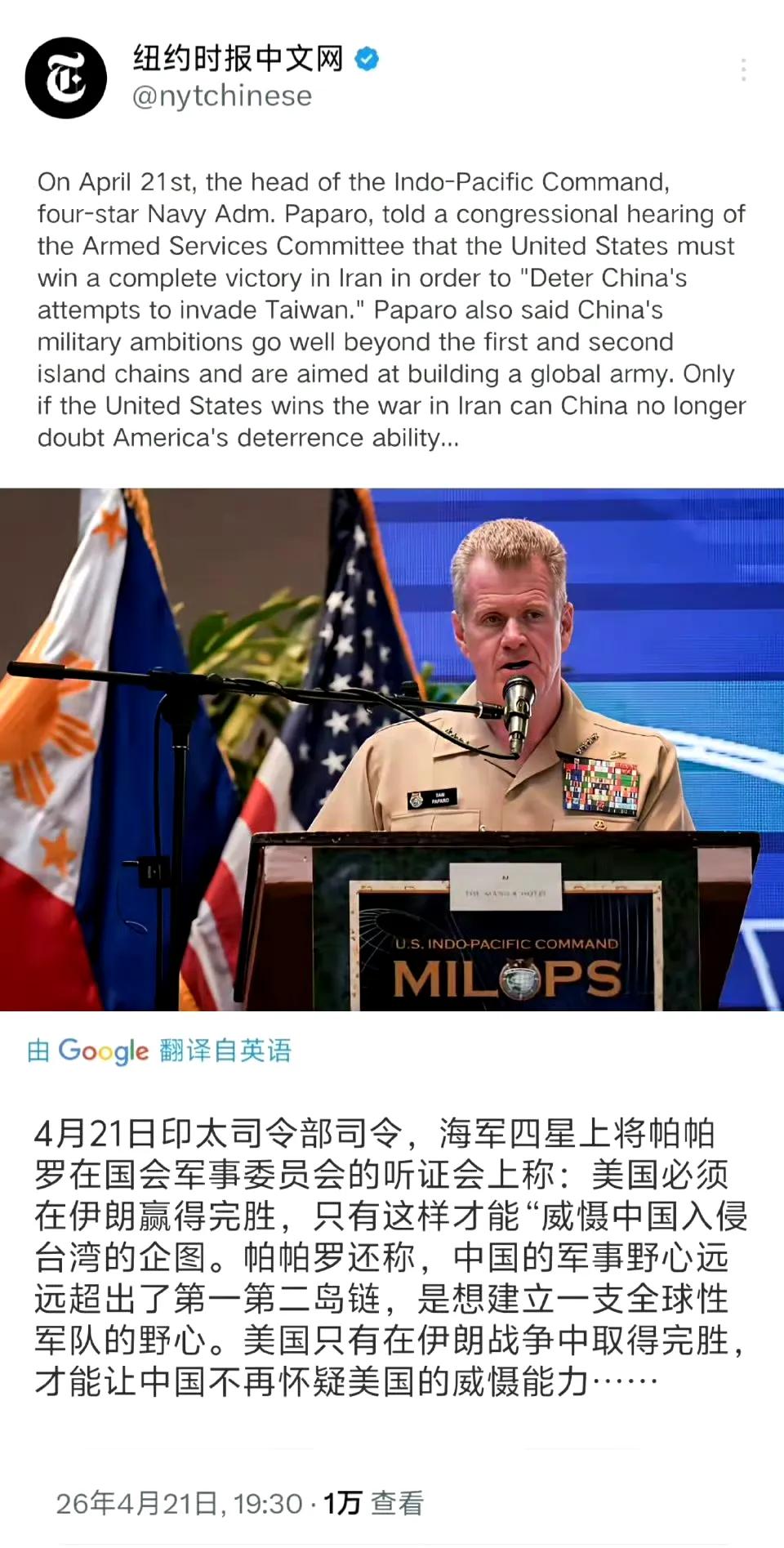 美军印太司令帕帕罗:“美国在中东地区,尤其是对伊朗的政策,必须以取得完胜为目标。只有我们在伊朗问题上展现出绝对的力量和决心,达成彻底的胜利,才能向包括中国在内的所有潜在对手传递清晰的信号 —— 美国有能力、有意志维护其全球利益和盟友安全。这种威慑力至关重要,它将直接遏制中国试图‘入侵’台湾的任何企图,让中国明白,挑战美国及其盟友利益的行为,必将付出沉重代价。” 帕帕罗这老小子真是笑死人不偿命,满嘴都是自不量力的鬼话,听着都让人觉得可笑又可悲!还大言不惭说 “美国在伊朗完胜,才能威慑中国”,我就想问一句:你们美国连伊朗都搞不定,还好意思在这吹牛逼、放狠话,妄图吓唬中国?脸呢? 美国在中东折腾这么多年,跟伊朗斗来斗去,除了搅得当地鸡犬不宁,到底赢了啥?打又不敢真打,制裁又没把伊朗搞垮,反而让自己陷入中东的泥潭拔不出来,耗钱耗力,连个小小的伊朗都拿不下,还妄想 “取得完胜”?纯属睁着眼睛说瞎话,自欺欺人罢了! 更可笑的是,你说什么搞定伊朗就能威慑中国 “入侵” 台湾,我看你是脑子彻底糊涂了!台湾是中国的地盘,中国护着自己的领土,天经地义,谈何“入侵”?我看你是脑子进水了吧? 就你美国的那点伎俩,全世界人都看得明明白白,无非就是想靠炒作伊朗问题,给自己脸上贴金,掩盖自己霸权衰落的事实,还想拿这个当借口,遏制中国发展、干涉台湾问题。可惜啊,你们连伊朗这关都过不了,还谈什么威慑中国?纯属痴心妄想、自取其辱! 别在这大放厥词了,帕帕罗!先好好想想怎么搞定伊朗再说吧,连个弱小国家都搞不定,还敢在这对中国指手画脚、放狠话,最终只会沦为全世界的笑柄,搬起石头砸自己的脚,自讨苦吃!