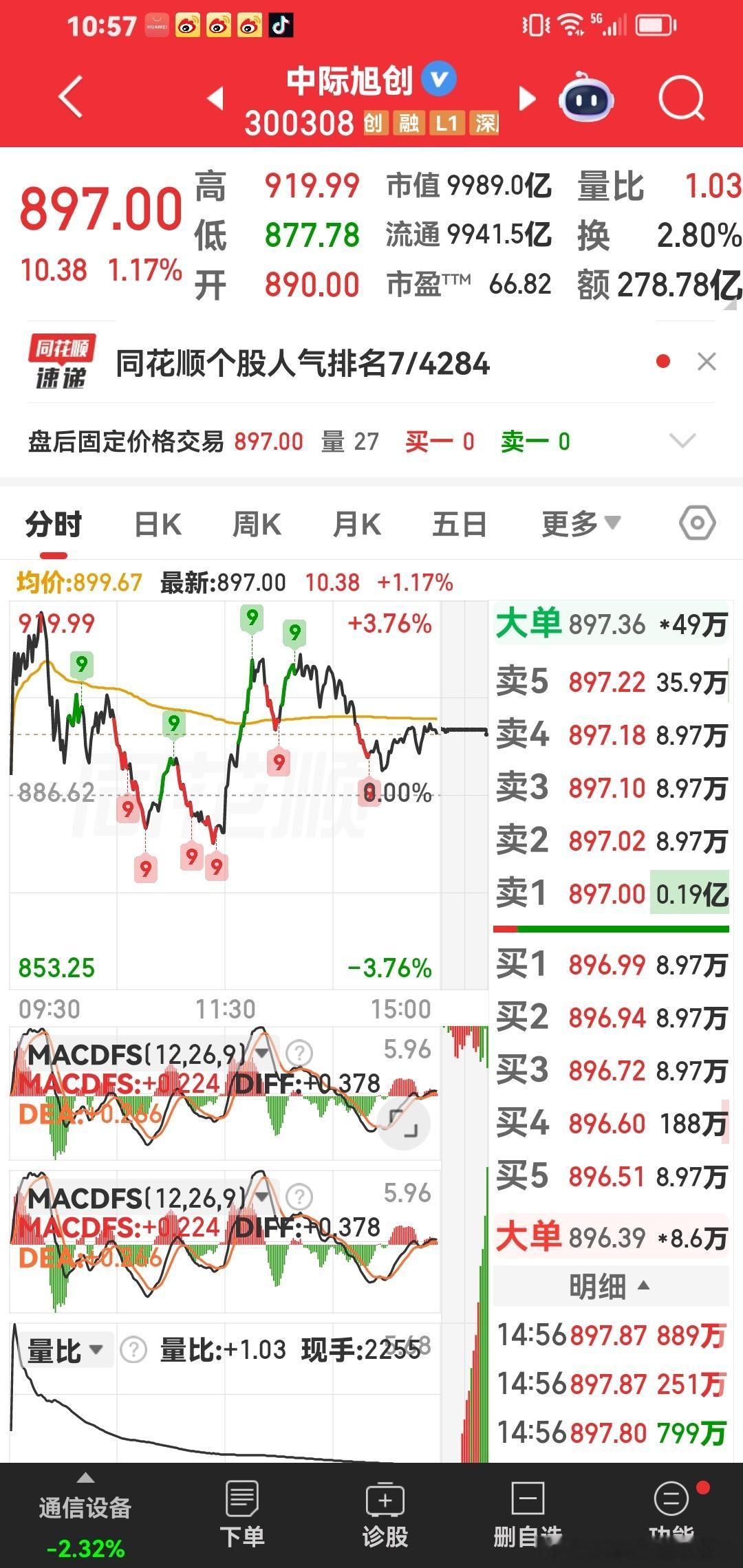 好票:中际旭创 。直接告诉你啦,这个票是CP0绝对龙头,成交量天花板,趋势主升,机构主力报团的天花板。能走出多远,我们就跟随多远。今天市值直接突破1万亿。明天又机会打破前高