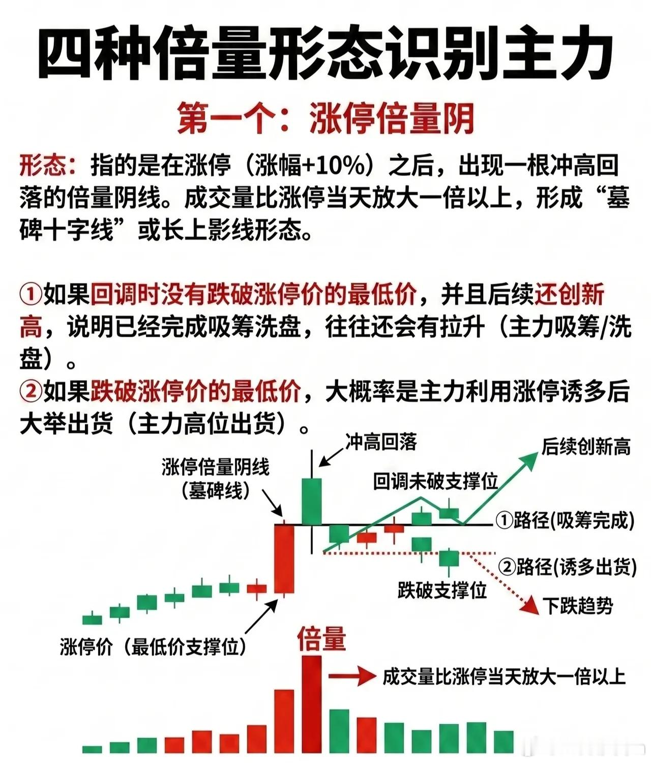 指在股价涨停(+10%)之后,次日出现一根冲高回落的阴线,且其成交量较涨停当日放大一倍以上,形成“墓碑十字线”或长上影线形态。这种形态常被视为主力资金行为的信号。