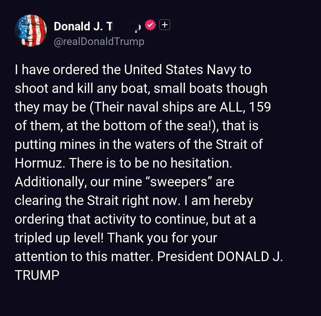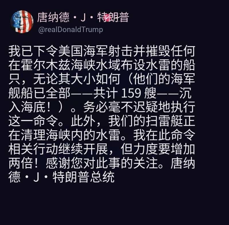 特朗普今晚(北京时间4月23日晚)发文写道;“我已经命令美国海军击沉任何在霍尔木兹海峡布雷的船只,无论大小(他们的海军舰艇全部159艘都已沉入海底!)。务必毫不犹豫。此外,我们的扫雷舰目前正在清理海峡。我在此命令继续进行这项行动,但力度要加强三倍!感谢各位对此事的关注。” [机智]评几句:这就等同于又开战了。特朗普一纸社交媒体令,把临时停火的脆弱平衡再次撕碎,嘴上喊着击沉布雷船、三倍扫雷,实则是用嘴炮延续军事威慑的拙劣戏码。特朗普一边违背停火协议持续海上拦截,一边靠虚假战绩糊弄国内民众。他无视油价飙升、民怨沸腾的现实,只顾着用强硬姿态刷存在感,到头来只会让霍尔木兹海峡的火药味更浓,把美国拖进更难抽身的地缘泥潭。