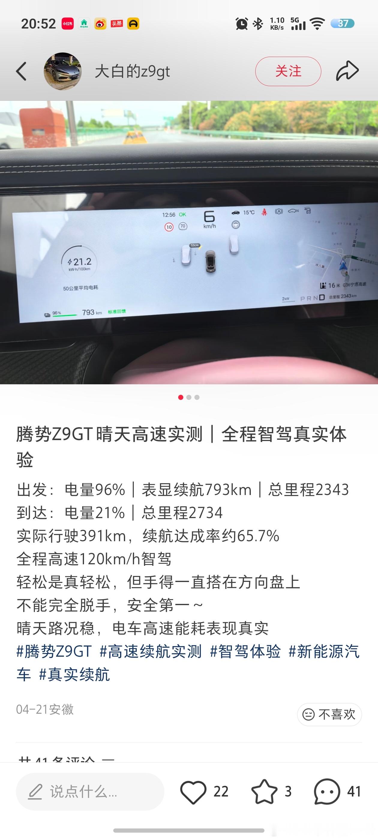 我看已经有用户提了腾势Z9 GT易三方闪充性能型顶配,全程120km/h高速智驾,晴天的情况下续航达成率在61%以上,我感觉这成绩还可以了。