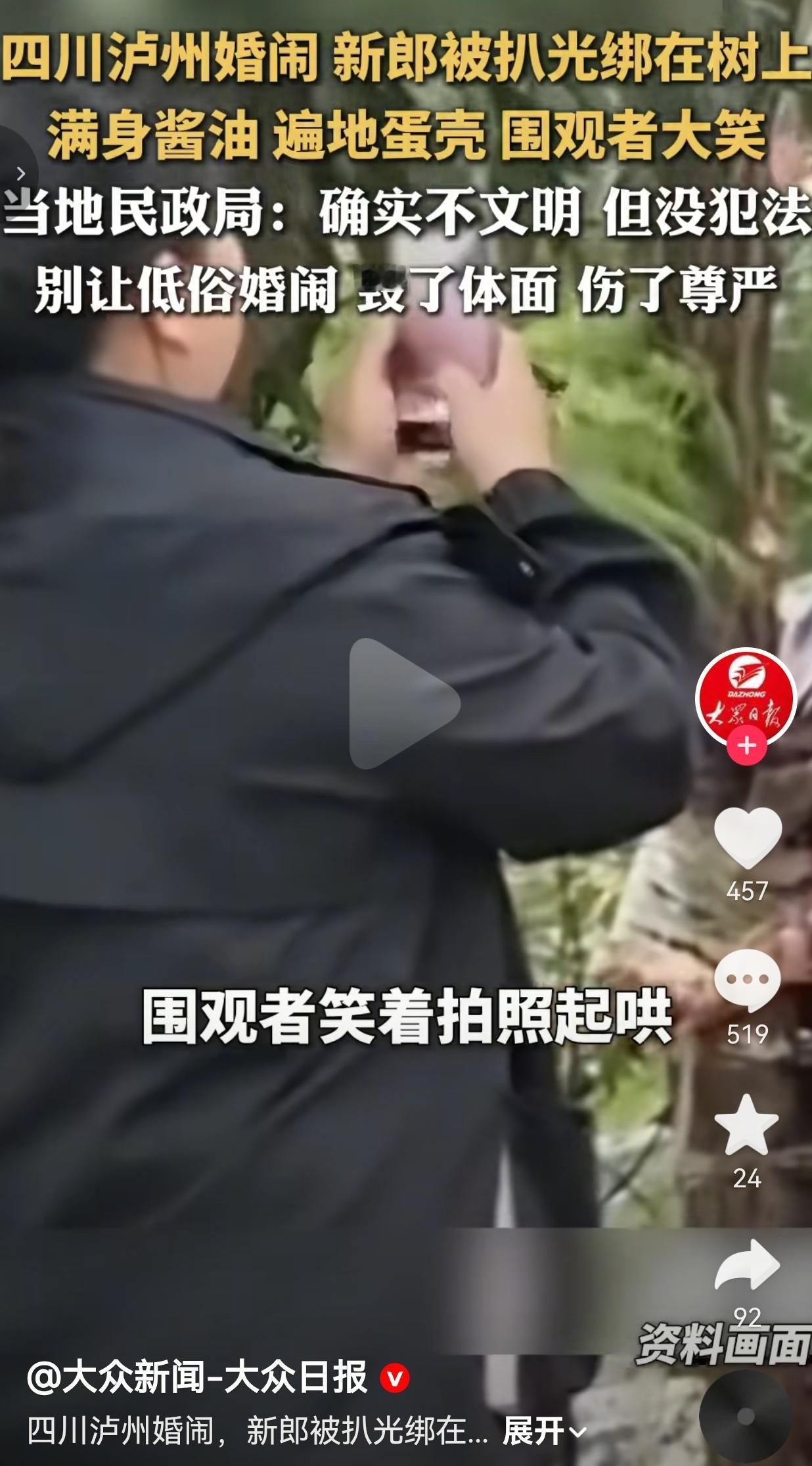 4月22号,四川泸州古蔺县,一名新郎在婚礼上被扒得只剩贴身衣物,直接绑在了小区门口的树上。 被人从头浇酱油、砸生鸡蛋,身上、地上一片狼藉,围观的人还笑着拍照起哄,没人上前阻止。 更讽刺的是,当地民政局之前才刚发过倡议书,明确“坚决抵制低俗婚闹”,结果转头就出了这事。 面对舆论,古蔺县民政局回应说,行为确实不文明,但没犯法,只是“庆祝方式不一样”。 可律师明确指出,这种行为已侵犯了人格尊严与人身自由,哪里是一句“不犯法”就能轻飘飘揭过的?我就想问:把人绑树上当众这么折腾,也能叫“庆祝方式不一样”? 网友看到后评论说:“这哪是婚闹,这是霸凌吧!把人尊严踩在地上,以后新郎出门怎么抬头?” 也有的网友说: “民政局的回应我真的服了,都这样了还不算犯法?那到底要闹到什么程度才算?” 还有的网友说: “我要是新郎,当场翻脸,这婚不结了!连自己都保护不了,谈什么幸福?” 更有网友表示: “以前婚闹是图个热闹,现在倒好,直接变着法子欺负人,越闹越没底线!” 说实话,我越看越生气,越想越后怕。 什么叫“庆祝方式不一样”?把人绑树、浇酱油、砸鸡蛋,一群人围着起哄大笑,这哪里有半分对新人的尊重?这哪里是“传统习俗”,分明是赤裸裸的人格侮辱!一个连新郎尊严都不放在眼里的婚礼,还谈什么祝福? 当地民政局前脚刚发了抵制低俗婚闹的倡议书,后脚就出现这么恶劣的行为,回应却轻飘飘一句“没犯法”,这不是纵容是什么? 别拿“传统习俗”当遮羞布,真正的婚闹,是给新人送祝福、添喜气,而不是借着“凑热闹”“沾喜气”的名头,把别人的体面踩在脚下,把婚礼变成施暴现场。 更可笑的是,在场那么多人,就眼睁睁看着新郎被当成“犯人”一样羞辱,没人出来说句公道话,连新郎自己都不敢反抗,这才是最让人寒心的地方。 现在很多地方的婚闹,早就变了味。打着“热闹”的幌子,行的是低俗、霸凌之事,把羞辱当成玩笑,把侵犯当成习俗。 可别忘了,婚礼是两个人一辈子的重要时刻,不是某些人发泄恶趣味的场合。 婚闹不是脱轨的借口,“不犯法”也不是纵容恶俗的理由,如果所谓的“热闹”,是建立在践踏他人尊严之上,那这种习俗,早就该被扔进垃圾桶了。 希望有关部门别再拿“不文明但没犯法”敷衍了事,唯有明确态度、依法整治,才能守住婚礼的庄重,别让低俗婚闹,毁了新人一辈子的体面和回忆。 最后我想说:婚闹不是胡闹,习俗不能越线;别让一时的恶俗,毁了一辈子的体面。 对此,你怎么看? 来源:大众新闻—大众日报