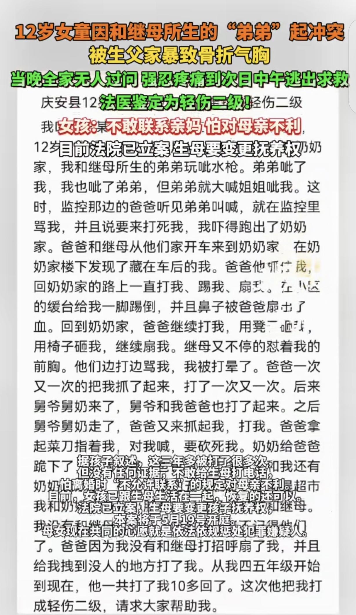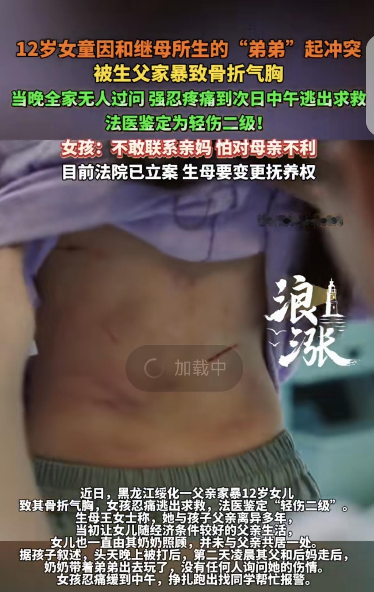黑龙江绥化,一12岁女孩,因和继母生的弟弟发生争执,被生父打到骨折轻伤2级,奶奶都不关心她伤情,她忍痛撑到第2天中午,逃出去求同学帮自己报警,生父继母虐待她3年,但她不敢联系亲妈,怕对妈妈不利,生母怒了,要求变更抚养权,严惩生父。网友:恶毒的女人,把亲爹的变成毒父了。 据4月23日浪涨新闻报道,一个12岁的小姑娘,就因为跟继母生的弟弟拌了几句嘴,被亲爹打得骨折还引发了气胸,法医鉴定下来是轻伤2级。 这姑娘的亲妈跟她爸离婚好些年了,当初想着前夫经济条件不错,跟着他能让孩子吃穿不愁,就把抚养权给了对方。 事实上,孩子根本没跟生父继母一起住,一直是奶奶在带。 这3年多里,姑娘没少挨生父的揍,可她愣是不敢给亲妈打一个电话,就因为离婚时的协议里,不让随便联系。 她怕自己找了妈妈,会让妈妈在跟前夫的拉扯里吃亏。 这次被打是头天晚上,疼得她直打滚,可家里没人当回事儿,没有一个人关心她伤的重不重,包括她奶奶。 转天一早,生父和继母出门了,奶奶也带着弟弟出去玩了,连句问她疼不疼的话都没有。 姑娘躺在那儿,疼得动不了,硬撑到中午,才攒够力气爬起来,一步一挪地逃出家门,找到同学帮忙报了警。 等亲妈接到消息赶过去,看着女儿身上的伤,心都碎了。 她赶紧把孩子接回自己身边照顾,现在姑娘恢复得还不错。 可一想到孩子这3年受的罪,亲妈就气得发抖,当下就决定要把抚养权夺回来,还得让孩子生父为自己的行为付出代价。 目前法院已经立案,抚养权变更的案子要到5月19号才开庭。 这期间亲妈怕前夫把孩子抢回去,特意找妇联申请了保护令。 娘俩现在就一个念头,就是要让法律好好治治那个动手打孩子的爹,不能就这么算了。 这事儿想想就寒心,亲爹对自己的闺女下这么狠的手,家里老人也不管不问,孩子得有多绝望。 希望法律能给孩子一个公道,也希望这姑娘能在亲妈身边,早点走出这段阴影,好好过日子。 12岁的孩子,本该在爸妈疼惜里长大,却要在亲生父亲的打骂和家人的冷漠里熬3年。 最让人心酸的是,孩子被打后不敢找妈妈,怕连累对方,这份懂事背后全是恐惧。 生母当初的选择,或许是出于“为孩子好”,可没料到经济条件换不来孩子的安全与温暖。 希望这次法律能给孩子撑腰,也提醒所有父母,孩子要的从不是优渥的物质,而是能遮风挡雨的爱与保护。 《最高人民法院关于适用〈中华人民共和国民法典〉婚姻家庭编的解释(一)》第56条规定:与子女共同生活的一方不尽抚养义务或有虐待子女行为,一方要求变更子女抚养关系的,法院应予支持。 生父长期虐待女儿致其轻伤2级,已严重侵害孩子身心健康,生母申请变更抚养权符合法定情形,法院应予以支持。 同时,生父的行为涉嫌故意伤害,需依法承担刑事责任。 对此,你怎么看?