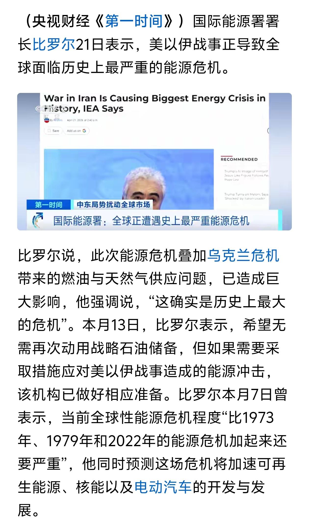 国际能源署预警:史上最严重能源危机来了!普通人该怎么办? 巴菲特说过:“别人贪婪时我恐惧,别人恐惧时我贪婪。” 国际能源署署长直接喊出:现在的能源危机,比1973、1979、2022年三次危机加起来还要严重! 中东战事掐住了全球能源命脉,叠加乌克兰危机的余波,油价、天然气的不确定性直接拉满。 这对普通人意味着什么? 1️⃣ 油价、化工品涨价,物价上涨的压力只会越来越大。 2️⃣ 新能源、核电、电动车会迎来加速发展,能源自主成了必选项。 3️⃣ 能源股、油气资产的避险和战略价值,正在被重新定价。 别等危机冲到眼前才慌神,提前看懂趋势,比啥都强。 ⚠️ 风险提示:本文仅为信息解读,不构成任何投资建议。能源价格受地缘、供需影响波动极大,请理性决策。 看懂的赶紧收藏!评论区聊聊:你觉得接下来油价会怎么走?