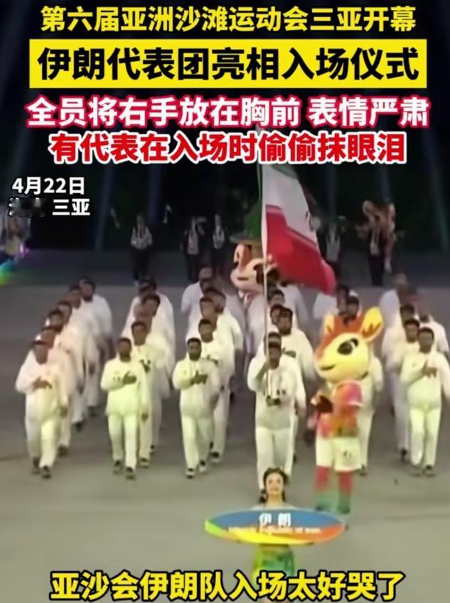 伊朗代表队入场,观众热烈欢迎,伊朗代表落泪! 2026年4月22日晚上,三亚亚沙公园的灯火照亮了南海之滨,第六届亚洲沙滩运动会在这里拉开帷幕,现场气氛热烈非凡,当播音员宣布伊朗代表团入场时,全场爆发出雷鸣般的掌声。 这支由几十人组成的队伍走得很稳,步调一致,所有人神情庄重,右手整齐地抵在左胸口,向四周看台微微欠身,这个简单的礼仪动作,让在座的观众感受到了他们骨子里的那份深沉与尊重。 在欢呼声中,几位伊朗运动员眼眶通红,甚至有人在行走间悄悄抹去脸上的泪水,这一幕被镜头捕捉到,瞬间让无数人共情,对于他们来说,来到这片宁静的赛场,绝不仅仅是参加一场体育比赛。 大家可能很难想象,这几十位运动员为了赴这一场中国之约,到底经历了什么,在外部环境极度复杂、交通渠道严重受限的情况下,他们这趟旅程走得异常艰辛,简直就是一场跨越千山万水的跋涉。 据相关报道显示,这支代表团为了顺利抵达海南三亚,整整在路上折腾了11天,因为某些众所周知的限制,他们无法像其他队伍那样直接飞抵目的地,只能选择最迂回、最耗费精力的路线。 他们先是从德黑兰出发,通过陆路交通长途颠簸,跨越边境抵达土库曼斯坦,接着从那里登机飞往北京,落后地后再马不停蹄地转往三亚,整个行程算下来,实打实的转运时间就超过了50个小时。 这种高强度的奔波,对需要保持竞技状态的运动员来说,无疑是巨大的身心考验,但在出发前,没有一个人提出异议,在他们看来,无论路途多么坎坷,只要能站在五星红旗下,这份付出就是值得的。 这种坚毅和执着,其实就是一个国家民族风骨的缩写,在一个身处风口浪尖、自身压力重重的背景下,他们没有选择关起门来,而是坚持走出来,向世界展示自己不屈的一面。 体育在这里早已超越了输赢本身,当这群在硝烟边缘生活的汉子,看到三亚亚沙公园里的欢声笑语和和平盛世,那种内心深处的触动是藏不住的,泪水里有对故乡的牵挂,更有对和平的向往。 现场观众给予的掌声,是给运动员的鼓励,更是对这种契约精神的敬佩,在这种双向奔赴的尊重中,我们看到了一种跨越国界的文明韧性,越是困难重重,这种守信的力量就越显得弥足珍贵。 伊朗代表团用他们的每一步,践行了什么是真正的体育精神,他们不是在顺境中锦上添花,而是在逆境里雪中送炭,这份沉甸甸的信义,让这场亚洲沙滩盛会多了几分动人心魄的人文底色。 很多人说,在这个瞬息万变的时代,承诺有时候很轻,但看着这群辗转万里、满脸疲惫却眼神坚定的运动员,你会发现,有些东西是永远不会过时的,那就是对友谊的珍视和对梦想的死磕。 这场跨海赴约,最终形成了一个完美的逻辑闭环,从德黑兰的出发,到三亚赛场的落泪,每一个环节都扣人心弦,它告诉全世界,无论外界环境多么嘈杂,总有人会为了心中的那份光,奔山赴海。 当开幕式的圣火点燃,这群来自远方的客人在温暖的海风中,终于可以暂时放下外界的纷扰,他们用自己的坚守赢得了全场的最高致敬,也让这届亚沙会成为了和平与友谊的最佳见证。