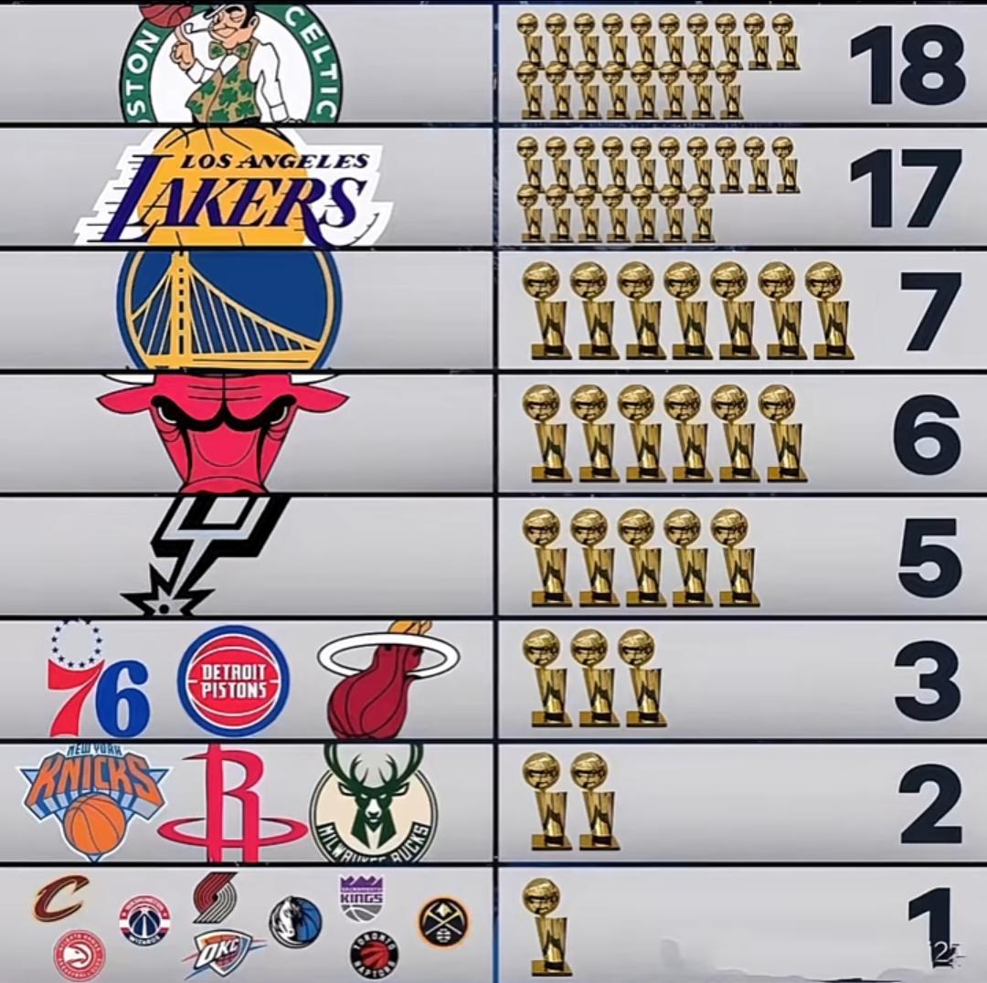 截至目前,NBA各球队总冠军数量排行榜出炉。绿军凯尔特人18座居首,洛杉矶湖人17座排第二,金州勇士7座排第三,芝加哥公牛6座第四。圣安东尼奥马刺5座排第五,76人、活塞和热火各3座并列第六。尼克斯、休斯顿火箭和雄鹿各4座并列第七,其余球队各有1座。 NBA榜 凯尔特队