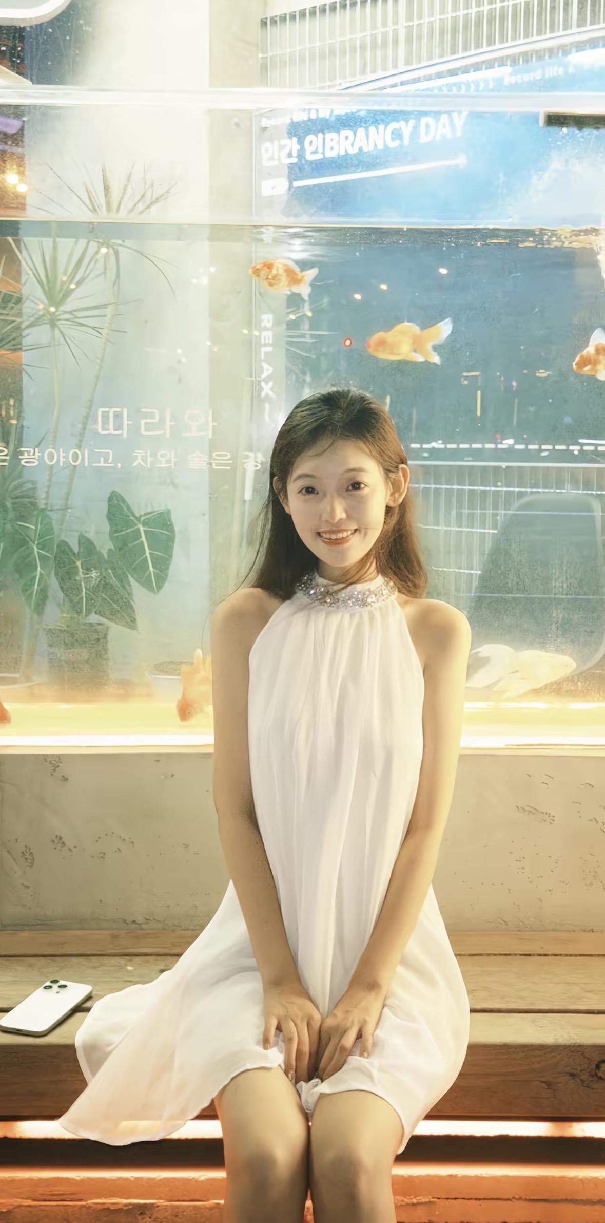 白色连衣裙,搭配清爽发型,坐在窗边,享受宁静时光。