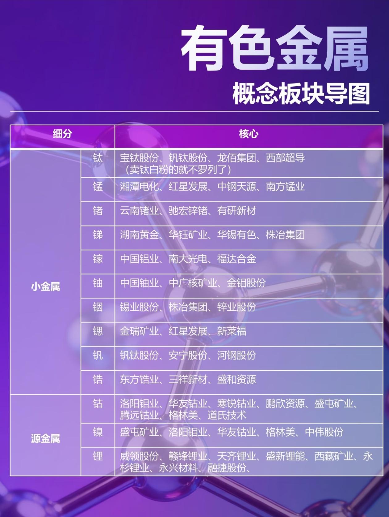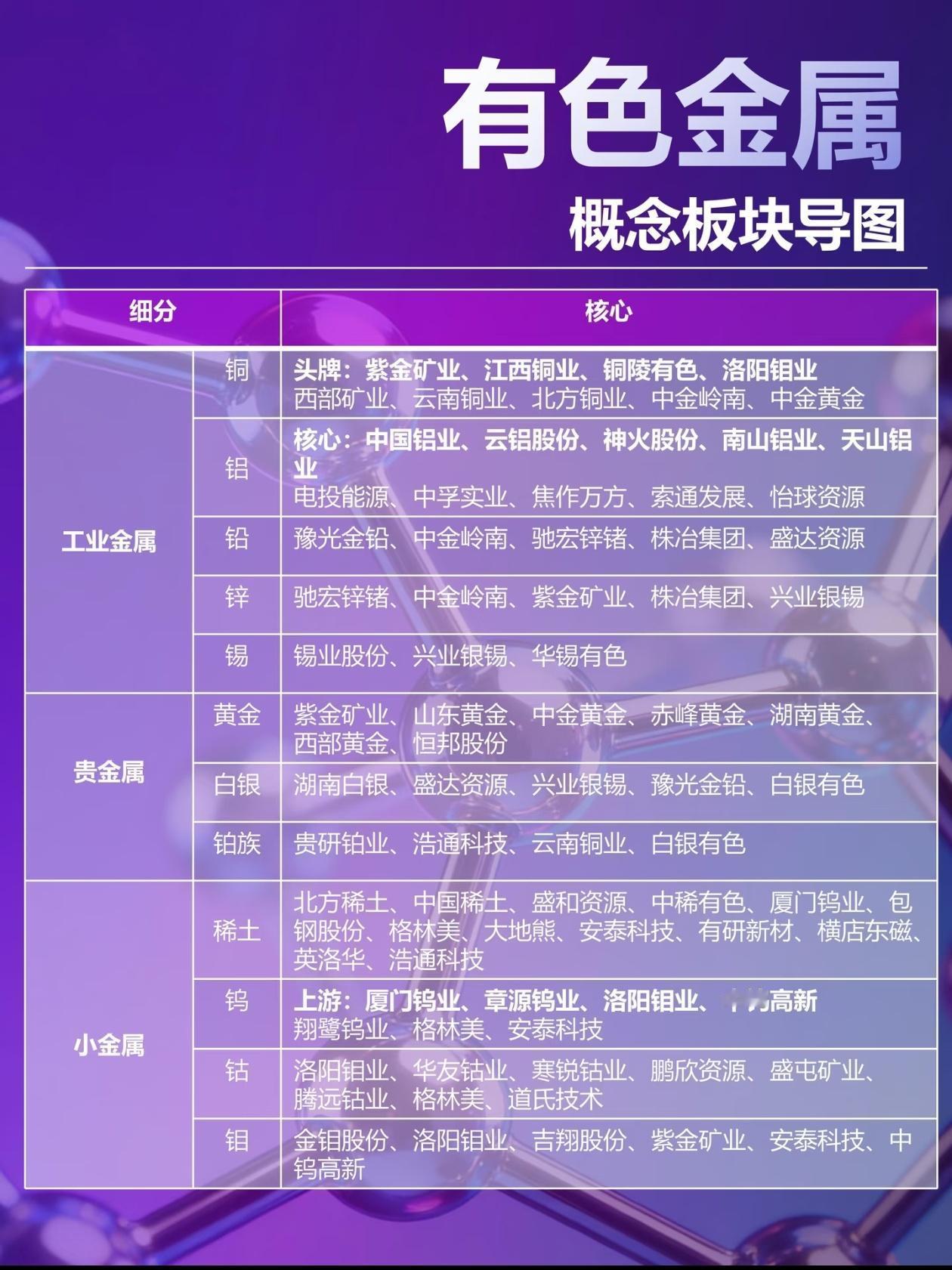 一张图吃透有色金属!再也不做接盘侠 别再乱买有色了!这张图直接把有色的四大板块、轮动顺序、核心标的全给你扒明白,看完秒懂! ✅ 贵金属(避险+金融) 乱世先涨黄金,通胀、降息、地缘冲突的首选;金银比破70,白银弹性直接起飞。 核心标的:紫金矿业、山东黄金、湖南白银 ✅ 工业金属(顺周期大宗) 经济复苏的“晴雨表”,铜先动,铝接力,基建、地产、制造业订单回暖就会启动。 核心标的:江西铜业、铜陵有色、中国铝业、云铝股份 ✅ 能源金属(新能源驱动) 绑定高景气赛道,锂、钴、镍、钒,供需缺口一出现,涨起来比谁都猛。 核心标的:赣锋锂业、天齐锂业、华友钴业、钒钛股份 ✅ 小金属(战略稀有) 稀土、钨、钼、锗、锑,供给刚性+国产替代+军工属性,行情末期最疯狂。 核心标的:北方稀土、厦门钨业、云南锗业、湖南黄金 利弗莫尔说过:“趋势总是按自己的节奏运行。” 有色的节奏就是:先避险,再复苏,后成长,最后疯狂。搞懂这个顺序,就不会在高位接盘! 建议收藏这篇,下次有色行情启动,拿出来对照就知道该买啥、什么时候跑! 评论区聊聊:你现在最看好有色里的哪个细分? ⚠️ 风险提示:本文仅为行业科普与规律分析,不构成任何投资建议。有色金属价格波动剧烈,相关标的存在多重风险,投资需谨慎,切勿盲目跟风。
