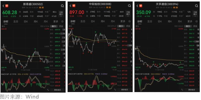 【易中天2025年合计净利润223亿元】新易盛一季报低于预期 4月23日晚,新易盛发布2025年报及2026年一季报。业绩报告发布后,新易盛在股吧讨论热度飙升,一举冲上股票热榜第一名。 至此,A股顶流“易中天”(新易盛、中际旭创、天孚通信)的“成绩单”,均已亮相。 截至4月23日收盘,新易盛、中际旭创、天孚通信三只股票的总市值分别为6046亿元、9989亿元和2722亿元,合计约1.89万亿元。2025年,“易中天”合计实现归母净利润223亿元。 此外,新易盛还公布了2025年度利润分配预案。公司拟向全体股东每10股派发现金红利10元(含税),以资本公积金向全体股东每10股转增4股。 新易盛系光互联解决方案领域的全球领先企业,业务主要涵盖全系列光通信应用的光模块的研发、生产和销售,产品服务于人工智能算力集群(AI Cluster)、云数据中心、电信网络(传输网络、5G无线网络、FTTx固定接入)等领域的国内外客户。 2025年,新易盛持续加强新技术、新产品研发及在各应用领域的市场拓展,当期实现营业收入248.42亿元,同比增长187.29%;归母净利润为95.32亿元,同比增长235.89%。 新易盛的营业收入主要来自于光互联产品的销售收入。2025年,新易盛光互联产品的营业收入为247.71亿元,占营业收入的99.72%。 2026年一季度,新易盛实现营业收入83.38亿元,同比增长105.76%,主要受益于终端客户算力投资持续增长;归母净利润为27.80亿元,同比增长76.80%。 新易盛单季营收规模首次突破80亿元关口,印证了全球AI算力基础设施建设的火热程度。但其净利润出现争议,虽然同比增长76.80%,但是环比下降13%。市场分析认为,该数据低于市场主流机构一致预期。 新易盛一季报显示,影响利润率的最大变量来自财务费用:一季度财务费用5.22亿元,而上年同期为-0.33亿元,主要系汇兑损失增加;同时,公司计提的资产减值损失0.83亿元,同比扩大。两项因素叠加,拖累净利率表现。 “易中天”组合的业绩,总体上颇为亮眼。 2025年,中际旭创营业收入达382.38亿元,同比增长60.25%;归母净利润为107.97亿元,同比增长108.78%。报告期内,受益于终端客户对算力基础设施的强劲投入,中际旭创产品出货较快增长,其中高速光模块占比持续提高,且随着产品方案不断优化、运营效率继续提升。 中际旭创的一季报业绩则超出市场预期。2026年一季度,中际旭创实现营业收入194.96亿元,同比增长192.12%;归母净利润为57.35亿元,同比增长262.28%。公司表示,业绩增长的主要原因是受益于终端客户对算力基础设施的强劲投入,公司产品出货持续增长。 中际旭创主营业务为高端光通信收发模块的研发、生产及销售,产品服务于云计算数据中心、数据通信、5G无线网络、电信传输和固网接入等领域的国内外客户。4月23日,中际旭创总市值一度站上万亿元关口。 2025年,天孚通信实现营业收入51.63亿元,同比增长58.79%;归母净利润为20.17亿元,同比增长50.15%。2026年一季度,天孚通信实现营业收入13.30亿元,同比增长40.82%;归母净利润为4.92亿元,同比增长45.79%。 公开信息显示,天孚通信立足光互连领域,为下游客户提供垂直整合一站式解决方案,包括多通道高速光引擎封装集成解决方案、高密度光互连集成解决方案、精密微光学组件解决方案等,同时得益于公司技术平台的高复用性,公司拓展了激光雷达、生物光子等新兴应用场景。(中证报)