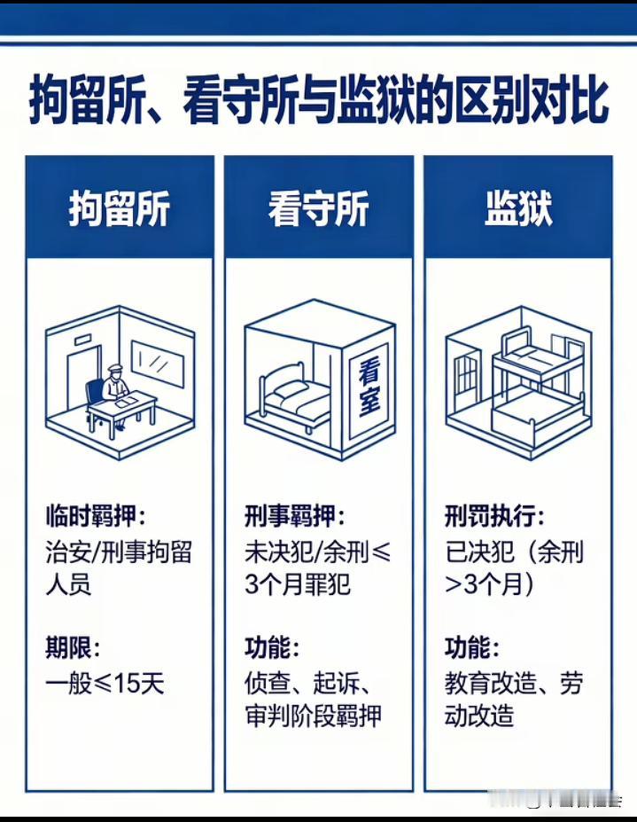 一张图看懂拘留所、看守所和监狱究竟有什么区别? 虽然这三个地方都是属于监狱系统的