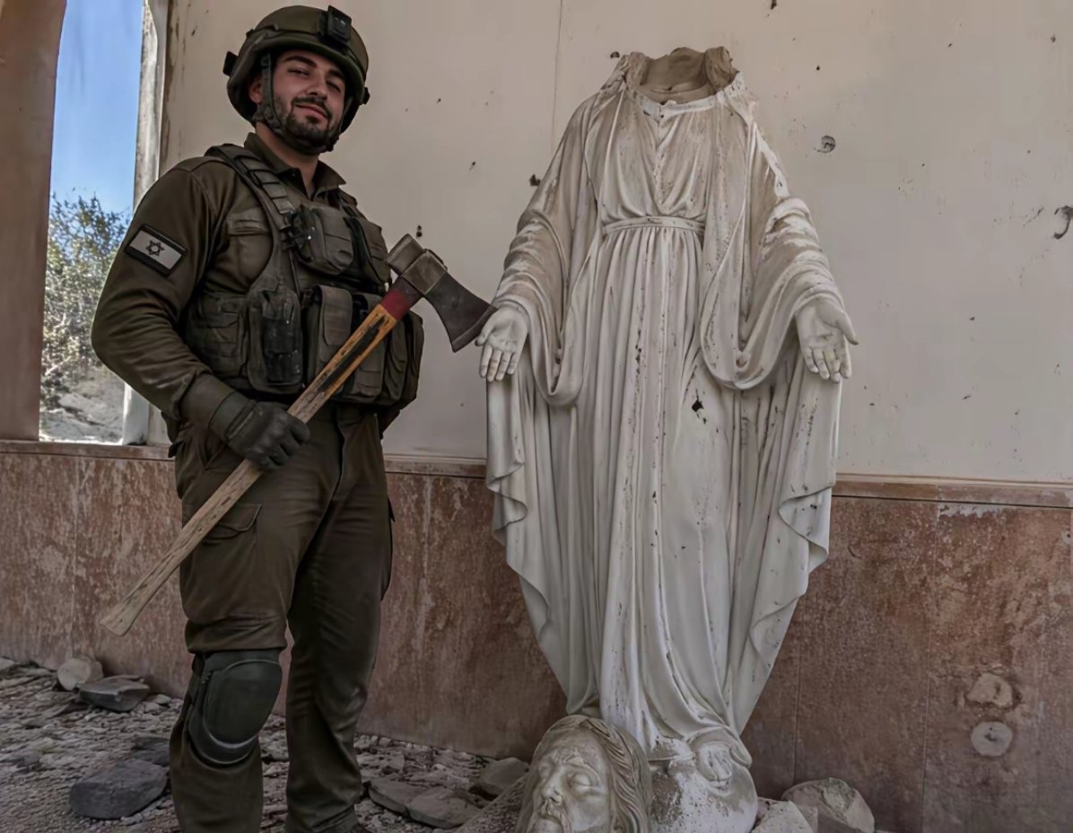 IDF又出妖孽,直接拿斧头将我主基督雕像斩首!看他那趾高气扬的表情,仿佛取得了重大胜利。军事