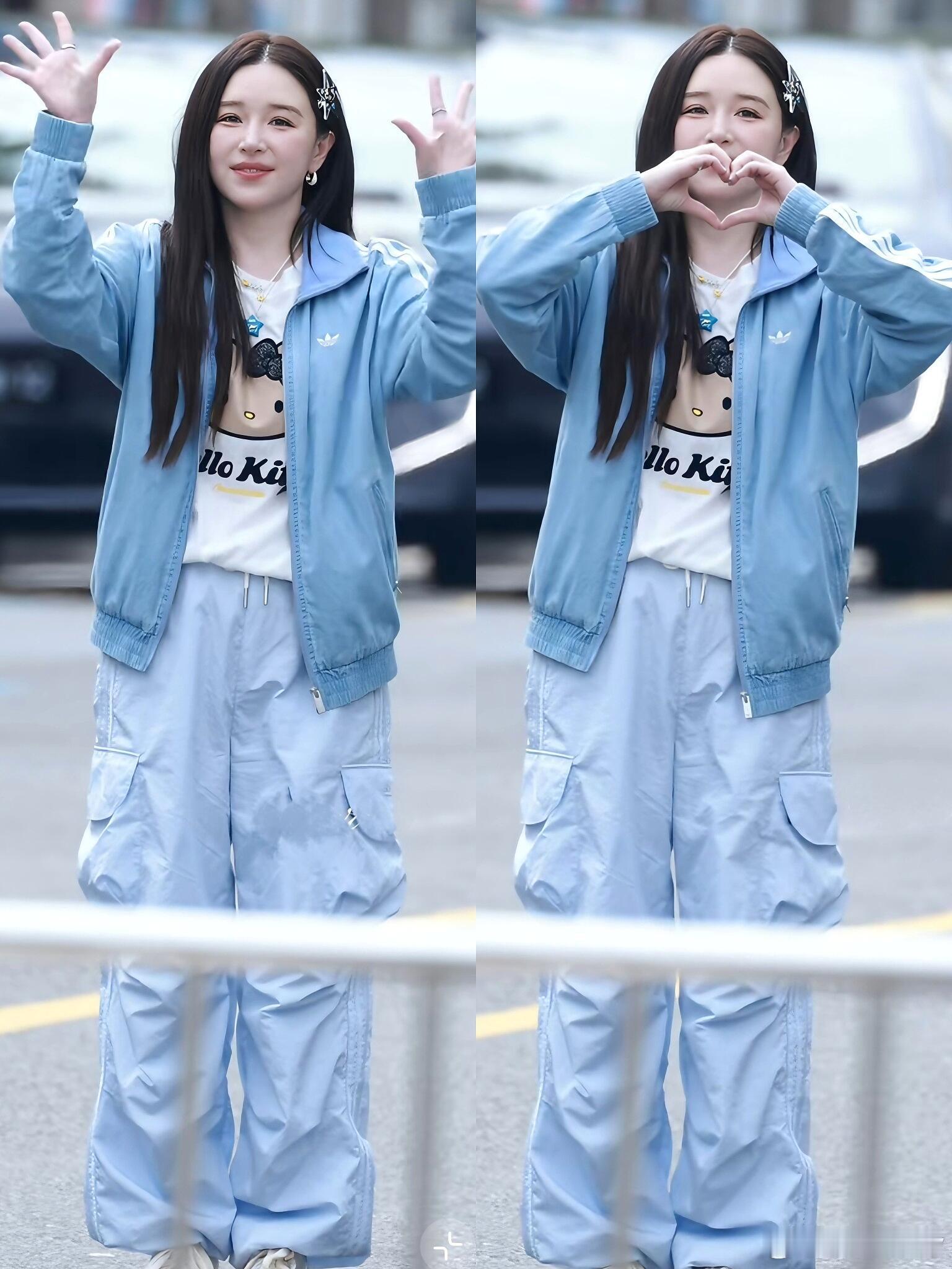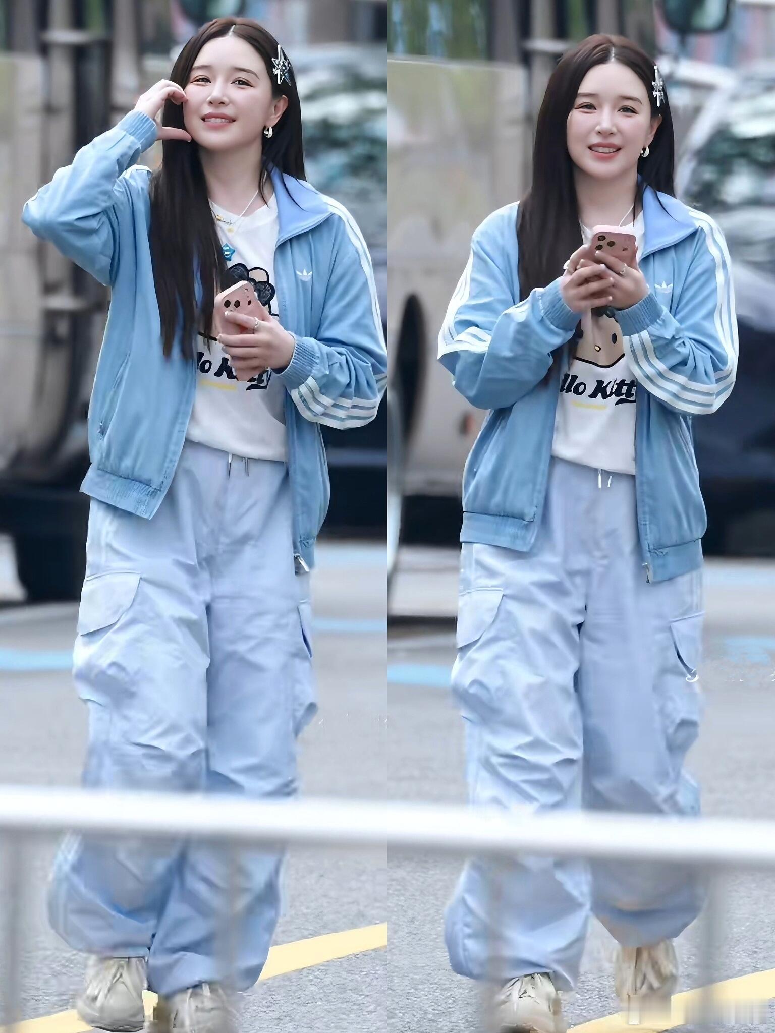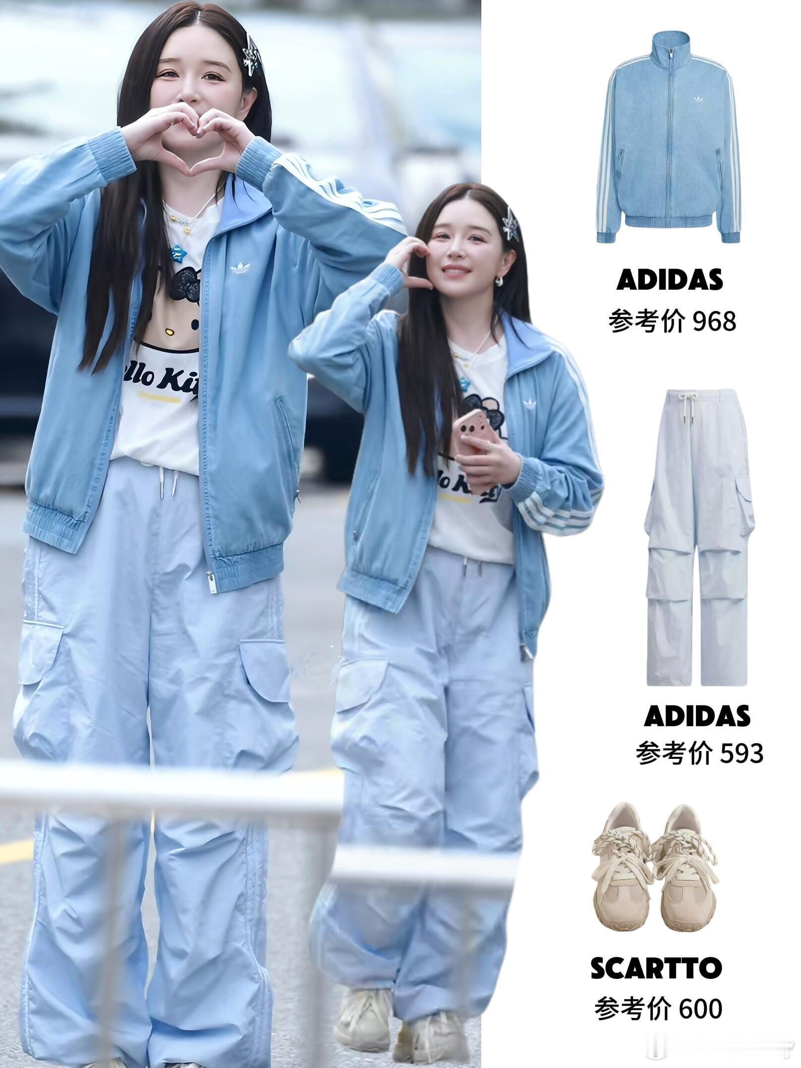 阚清子×浪姐|清爽氧气感甜妹风穿搭解析整体是Softfit轻运动甜妹风,以「同色系深浅蓝」打造层次,把休闲运动穿出了元气少女感。- 上半身:浅蓝阿迪达斯三叶草牛仔风运动夹克,自带复古校园感,搭配Hello Kitty印花白T,中和了运动装的硬朗,添了几分软萌少女心。