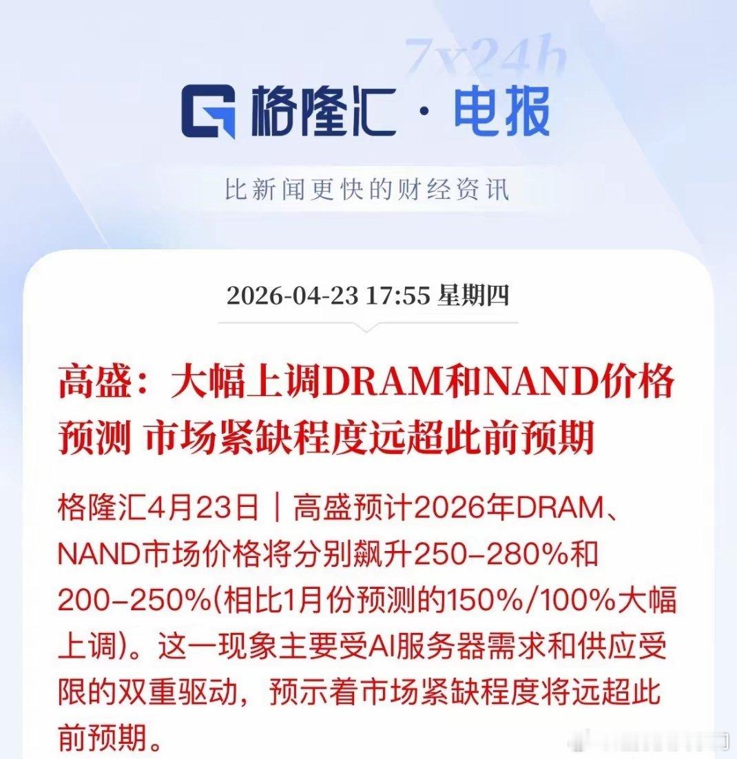 存储芯片超级周期全面开启高盛大幅上调2026年存储涨价预期,DRAM涨幅看至250%-280%,NAND大涨200%-250%,较年初预测直接翻倍,行业紧缺程度超预期。核心逻辑源于双向失衡:AI服务器爆发拉动高性能存储刚需,叠加大厂前期减产,短期产能修复缓慢,供需缺口持续扩大,推动价格强势上行。核心受益方向1. 存储模组涨价周期下库存与售价双重增值,业绩弹性突出。代表:佰维存储、德明利、香农芯创。2. 存储设计受益行业涨价与国产替代,细分赛道优势凸显。代表:兆易创新、澜起科技、北京君正、聚辰股份。3. 设备材料+封测大厂加速扩产,上游设备、耗材、封测订单充足,需求确定性强。代表:中微公司、北方华创、长川科技、深科技、长电科技等。当前存储景气周期强度与持续性有望超预期,不过板块已有阶段性涨幅,短期不宜盲目追高,可关注回调后的低吸机会。全球存储芯片 ⚠️个人观点,不构成任何投资建议,股市有风险,投资需谨慎。