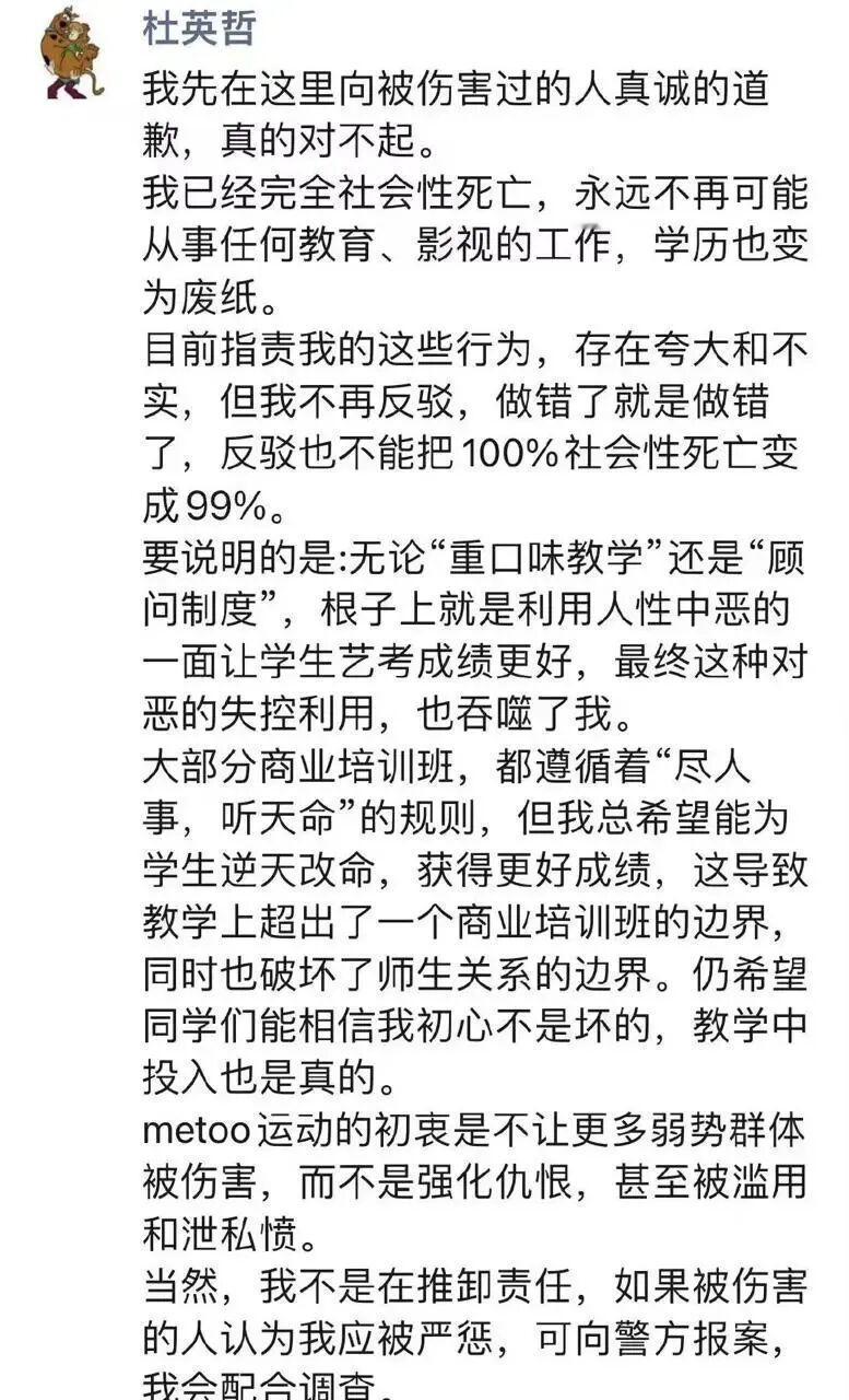 “艺考圈房思琪案”将开庭,21名女学生实名举报杜英哲性侵,多次以缠胸调整衣物为由猥亵女性,受害女生称被杜英哲强奸其妻子也在场。 在艺考圈里,他可是实打实的“大神”。 2007年他开了个艺考机构叫“影路站台”,天天宣传“高升学率”“独家考官资源”,吹得天花乱坠,很快就火了,还被人尊称为“影视艺考第一人”。 现在回头看,那些所谓的光环,全都是他用来迷惑人的幌子。 来他机构学习的,全是十七八岁的小姑娘,最小的还没成年,大多是普通家庭的孩子,把艺考当成改变命运的唯一出路,真心实意把杜英哲当成能帮自己圆梦的老师。 可谁能想到,这个看起来文质彬彬、满口“艺术”的人,心里藏的全是肮脏的心思,利用孩子们的信任和梦想,在机构里作恶十几年,想想都让人脊背发凉。 21个女生,年龄从17岁到24岁不等,她们的遭遇,从2006年一直持续到2019年。 整整十几年啊,不是一时兴起,是杜英哲有恃无恐的常态化犯罪。 最让人恶心的是,杜英哲作恶从来都不直白,专挑“教学指导”当借口,隐蔽得不行。 懂艺考的都知道,面试形象确实重要,杜英哲就抓住这一点,天天给女生灌输“名校考官就喜欢身形挺拔、穿着干练的,你这样松松垮垮的肯定不行”。 小姑娘哪懂这些,只觉得是老师负责,加上迫切想考上名校,只能乖乖配合。 可她们不知道,这一配合,就掉进了杜英哲的陷阱里。 有受害者回忆,杜英哲每次缠胸,都要把女生单独叫到封闭的办公室或者小房间,全程亲手操作,完全不顾及女生的抗拒和紧张。 他用胶带在女生胸口反复缠绕、按压,嘴里还假惺惺地说“这样才好看,考官一看就喜欢”,可手上的动作,全是猥亵的意味。 更过分的是,他还会借着调整衬衫领口、整理衣角的名义,随便碰女生的胸部、后背和腰部,小姑娘吓得浑身僵硬,却不敢反抗。 有人试过拒绝,可她马上就变脸。 “不配合就别想考名校,我手里的考官资源,能让你过,也能让你彻底被艺考圈封杀,这辈子都别想从事这行。” 对于这些把梦想当成全部的女生来说,这话就是致命的。 更让人寒心的是,他的妻子陈某,竟然全程帮凶,看着自己的丈夫伤害这些小姑娘,不仅不阻止,还主动帮忙。 根据多名受害者说,陈某不仅不拦着杜英哲,还主动帮他筛选那些“听话”“好控制”的女生。 整个过程中,陈某就坐在旁边,一动不动地看着,一句话都没说,也没做任何阻止的动作。 除此之外,他还经常在课堂上贬低女生,给她们灌输“想要成功就要付出代价”这种畸形的观念,让很多未成年女生误以为,被老师侵害是“艺考必经的过程”,是“实现梦想的代价”。 久而久之,这些女生变得自卑、敏感,就算被伤害了,也觉得是自己的问题,不敢告诉家人,更不敢报警。 这些女生,本来都是心怀梦想、眼里有光的年轻人,她们带着对未来的憧憬,来到“影路站台”,希望能通过自己的努力,考上心仪的艺术院校,实现自己的梦想。 可她们怎么也没想到,自己真心信任的老师,竟然会亲手摧毁她们的梦想,把她们拖进黑暗的深渊。 从2022年被举报,到现在正式开庭,整整过去了近四年。 这四年里,这21名受害者,一直没有放弃,她们一边疗愈自己的伤痛,一边配合警方调查,只为等到一个公正的判决,只为让杜英哲付出应有的代价。 对于这件事,您有什么想说的吗?欢迎评论区留言讨论。 信息来源: 闽南网 2026-4-23