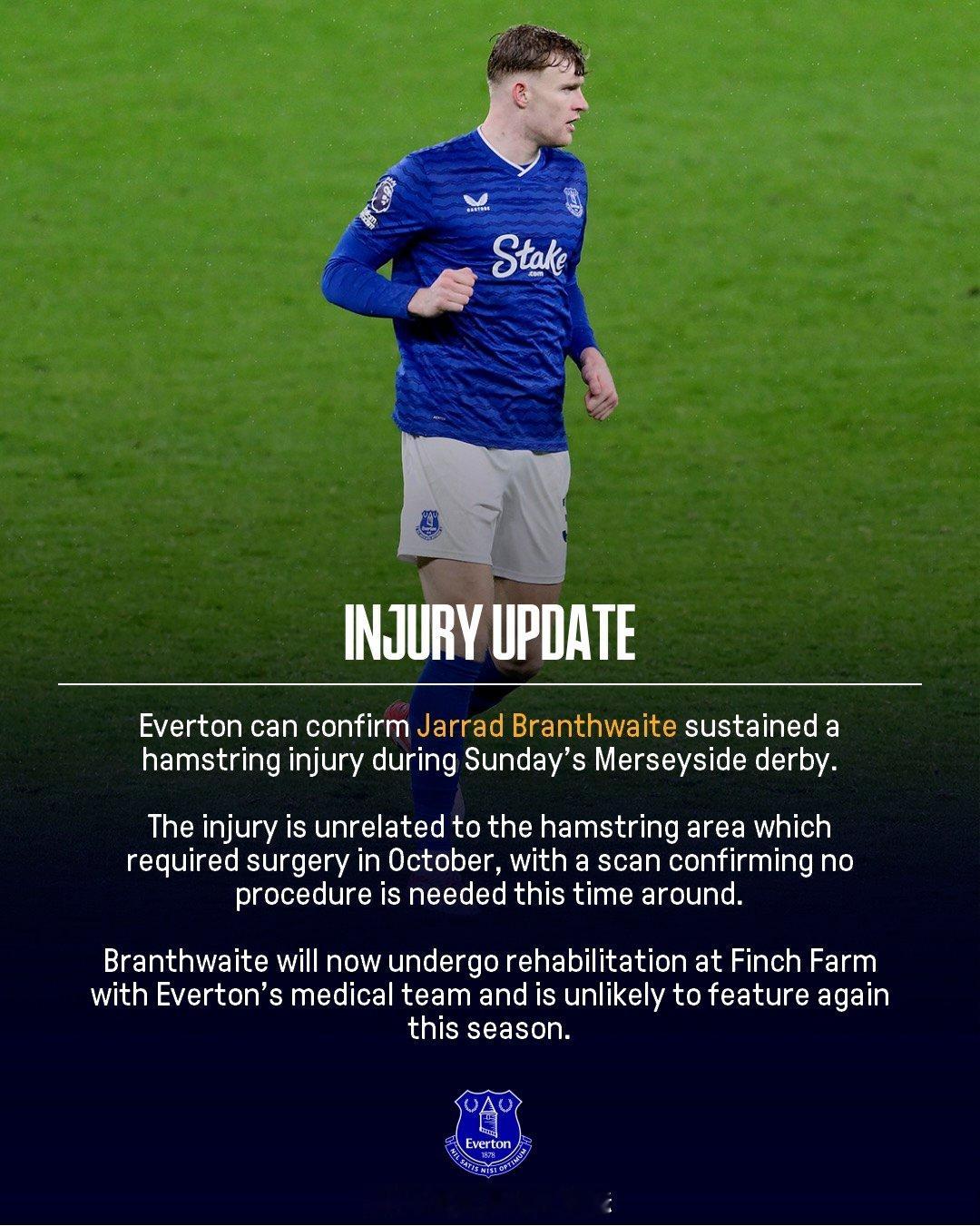 【布兰斯维特赛季报销】埃弗顿主力中卫布兰斯维特,本赛季一直被伤情困扰,只为球队出