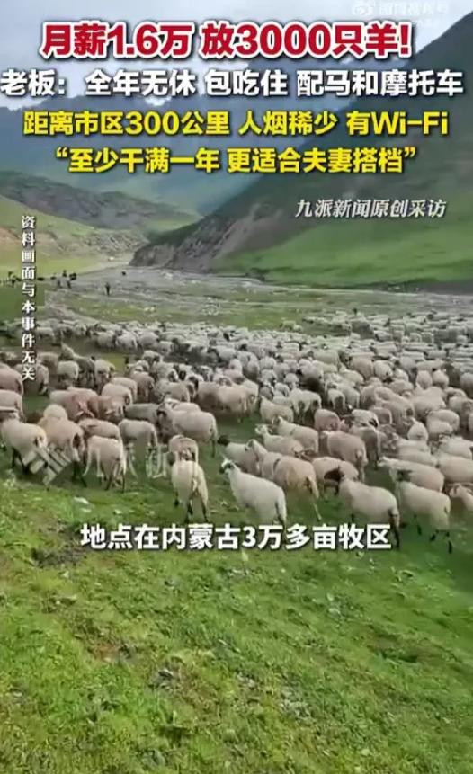 放3000只羊,月薪1.6万,年薪19.2万,看起来还可观,最开始还有网友蠢蠢欲动,但有网友一算账,发现并不划算,还有人劝南方人别动这个心思。 要知道,在当下的就业市场里,不少普通岗位月薪不过四五千,即便是在一二线城市,月薪过万也需要付出不小的努力,更别说这份工作看似无需太高学历、不用挤地铁通勤,还能每天置身于辽阔的大草原,欣赏蓝天白云、风吹草低见牛羊的美景。 很多网友一开始都蠢蠢欲动,甚至在评论区留言,说自己愿意放弃城市的工作,奔赴草原开启“诗和远方”的生活,觉得这简直是天上掉下来的好差事。 可很少有人知道,这份看似轻松的高薪工作,背后藏着太多不为人知的艰辛,而雇主的招聘背后,也有着自己的考量。 据了解,发布招聘的老板,在当地拥有一片三万多亩的牧区,这个面积差不多相当于28个故宫大小,要照看的羊也有3000多只,这么大的规模,单靠一个人根本难以完成。 也正因为如此,老板更倾向于招聘夫妻搭档,一人负责放羊巡查,一人负责做饭打理日常,这样既能提高工作效率,也能让从业者在偏远地区相互陪伴,更容易长期坚持。 随着网友们的深入拆解,这份工作的“真面目”也逐渐浮出水面,原本蠢蠢欲动的人,大多瞬间冷静下来。 最让人意外的就是薪资的猫腻,很多人一开始以为1.6万是单人月薪,可仔细一算才发现,这其实是夫妻二人的共同薪资,折算下来每个人每个月只有8000元。 看似可观的年薪,分摊到两个人身上,再结合高强度的工作,性价比瞬间大打折扣,这也是为什么有网友一算账,就直言这份工作并不划算。 这份工作的艰苦,远不止薪资分摊这么简单。 牧场地处距离市区300公里的无人区,常年见不到陌生人,平时连手机信号都没有,虽然配备了WiFi,但到了冬季雨雪天气,网络经常中断,从业者几乎处于与世隔绝的状态。 长期的孤独感,其实比体力劳作更磨人,就像那些常年驻外、守岛的工作一样,看似高薪,实则要付出巨大的精神代价,甚至有研究表明,长期独处还可能影响认知能力和大脑结构。 更让人难以承受的,是当地的气候和全年无休的工作节奏。 内蒙古的冬季漫长而严寒,长达半年的时间里,气温经常低至零下四十多度,还会伴有呼啸的白毛风,户外作业时,哪怕裹得再厚,也难以抵挡刺骨的寒风。 每到冬天,草原上的草全部枯萎,无法自然放牧,从业者每天都要人工投喂两次羊,每次耗时都在两个小时以上,高强度的体力劳动,对人的身体素质是极大的考验。 而这份工作全年无休,没有节假日,没有周末,哪怕是过年,也只能在牧区坚守,连与家人团聚的机会都很少。 除此之外,这份工作的责任也十分重大,羊只如果出现消瘦、丢失、死亡等情况,全部都要由从业者承担责任,追责条款十分严苛。 对于常年生活在温暖湿润地区的南方人来说,这样的工作环境更是难以适应,零下几十度的严寒、漫长的冬季、偏远的无人区,每一项都是难以跨越的坎,也正因为如此,有不少网友善意提醒,南方人千万别动这个心思,免得得不偿失。 网络上,网友们的观点也两极分化,一部分人向往这种远离城市内卷、清静自由的生活,觉得哪怕辛苦一点,也比在城市里看老板脸色、挤地铁通勤强; 但更多的人表示,即便薪资再高,也不愿意接受这种全年无休、与世隔绝的工作模式。 事实上,这份工作也确实只适合少数人,要么是长期从事放牧工作的专业人员,要么是性格安静、不喜社交,渴望远离复杂人际关系的人,对于大多数普通人来说,这样的工作,看似诱人,实则难以坚持。 雇主开出这样的高薪,也并非慷慨,而是因为这份工作的门槛看似低,实则要求极高,能长期坚持下来的人寥寥无几,高薪不过是对从业者辛苦付出的一种补偿。 就像那些在偏远地区坚守的工作者一样,他们拿着比普通人高的薪资,背后却是常人难以想象的孤独和艰辛,没有所谓的“不劳而获”,每一份高薪的背后,都藏着相应的付出。