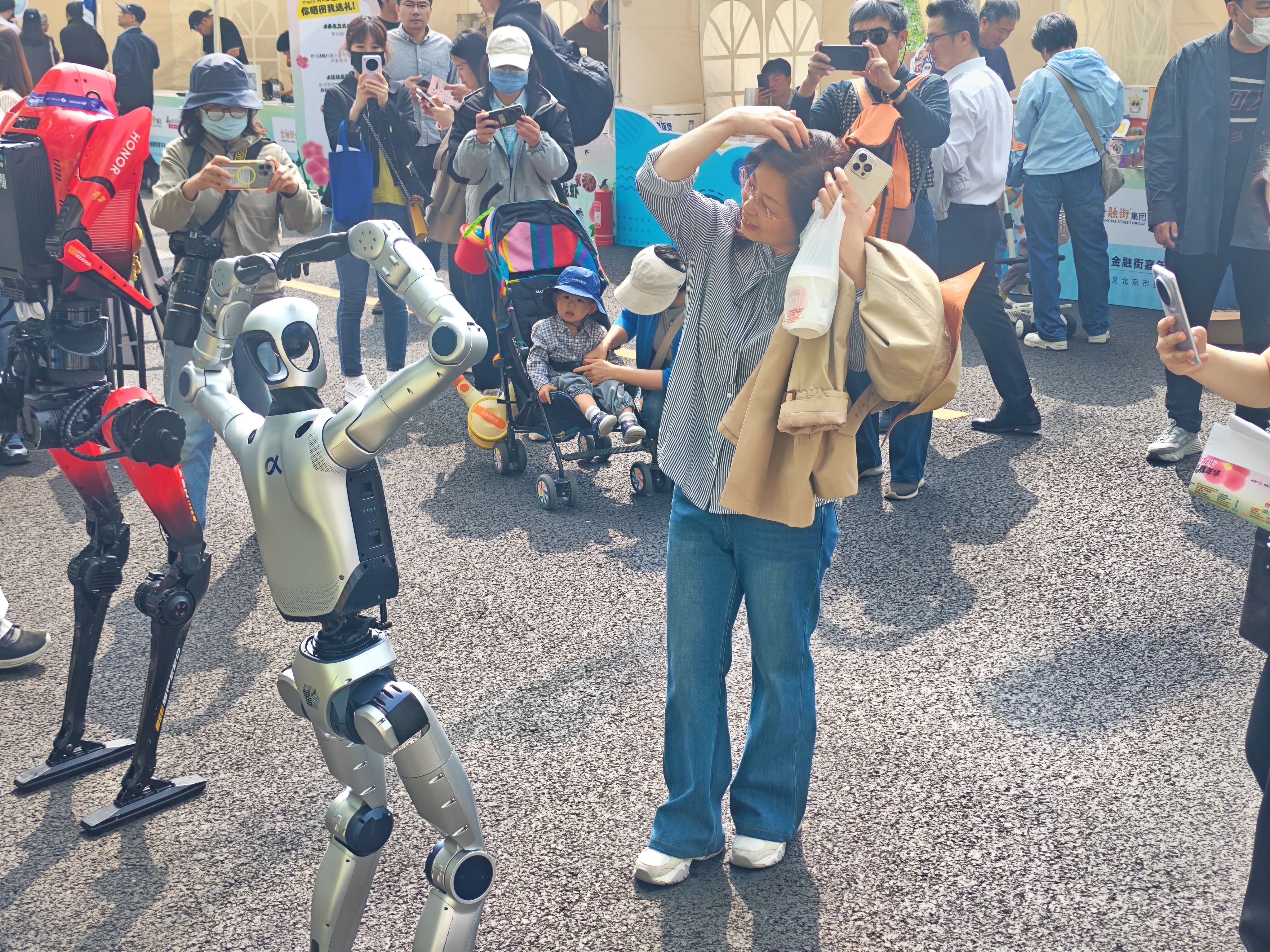 荣耀机器人夺冠后首次亮相荣耀人形机器人闪电,夺冠后第一时间跑来金融街打工了!和观众互动玩的很嗨啊!