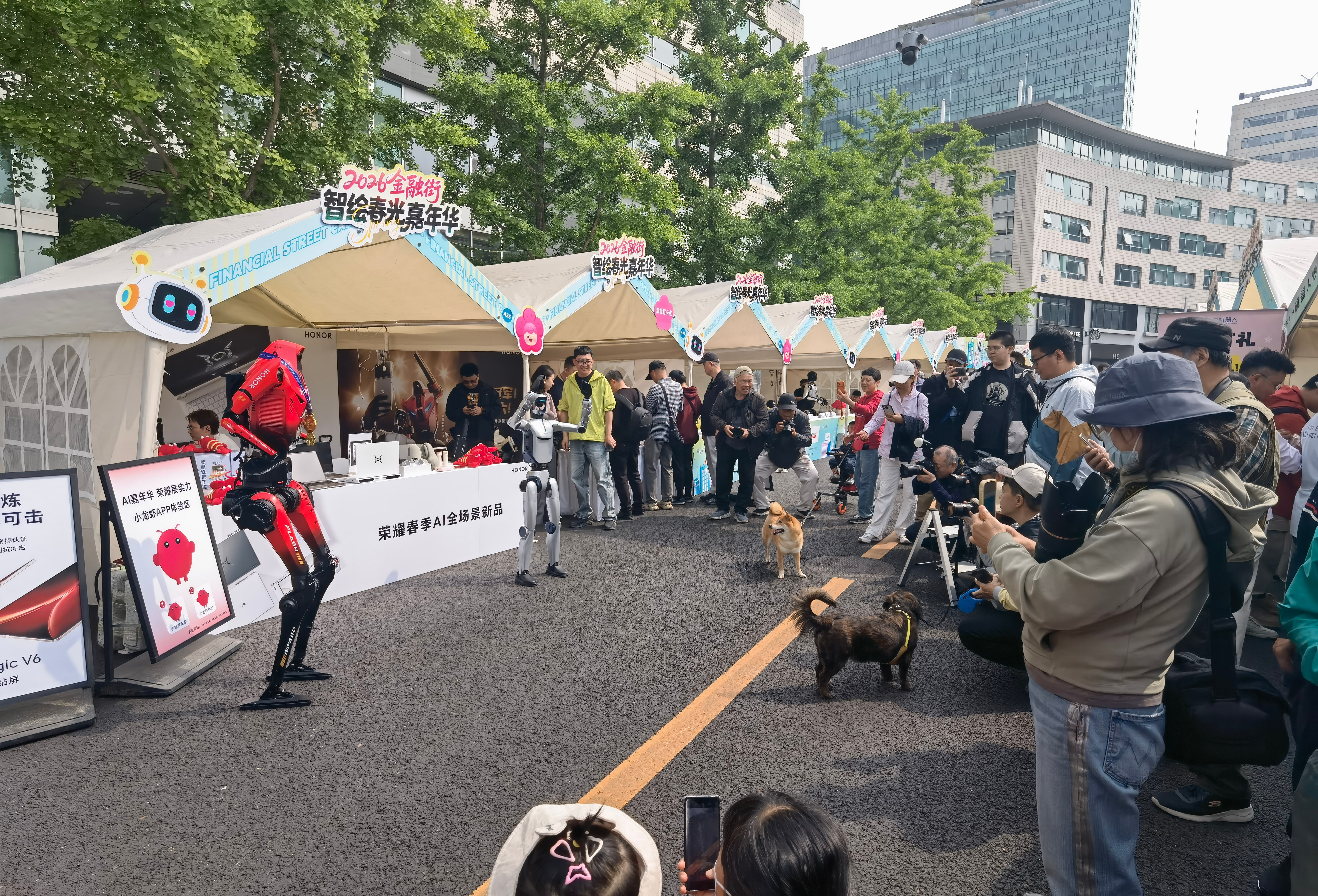荣耀机器人夺冠后首次亮相荣耀人形机器人闪电,夺冠后第一时间跑来金融街打工了!和观