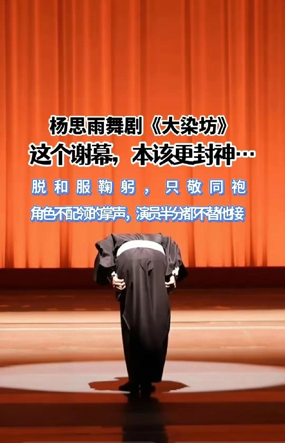 全网刷屏!舞剧演员杨思宇谢幕脱和服鞠躬,家国格局引全网点赞 4月24日,演员杨思宇火速冲上热搜!舞剧《大染坊》谢幕名场面全网爆火。 他饰演日方反派角色,身着和服完成角色告别后,当众褪去和服,换上中式内搭,郑重向观众鞠躬。 杨思宇正面回应,这是导演精心设计,寓意撕掉角色皮囊,坚守中国本心。戏里演绎角色,戏外坚守立场,艺术无国界但演员有国籍。 这波走心又有格局的操作,瞬间圈粉无数,网友纷纷称赞:三观超正,尽显家国情怀! 杨瀚森西装秀 杨和苏变装