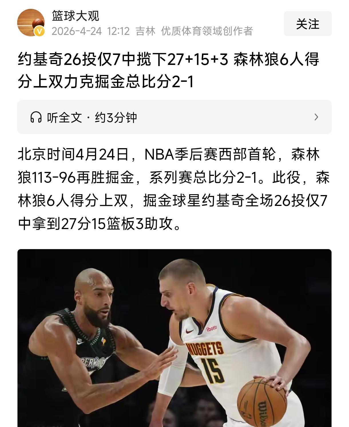 约基奇连戈贝尔都打不过。 今天森林狼战胜掘金, 约基奇在戈贝尔防守下, 全场狂砍27分15篮板, 感觉又把戈贝尔按地上摩擦了, 结果掘金输给森林狼近20分。 约基奇全场26投7中, 疯狂出手换来的漂亮数据, 掘金也以大比分1:2落后森林狼, 只要肉盾戈登不复出, 掘金基本已经难过首轮了。 当年在老迈的霍华德面前, 约基奇打的效率特别低下, 没想到湖人管理层转头送走霍华德和大麦基, 给约基奇提供了绝佳的复仇詹姆斯机会。