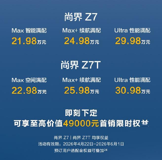 尚界品牌官宣肖战为首位代言人后,品牌第二款车型Z7/Z7T也正式上市,价格较预售整体下调1万元,均推出Max、Max+、Ultra三个配置版本。其中,Z7起售价为21.98万元,Z7T起售价为22.98万元。