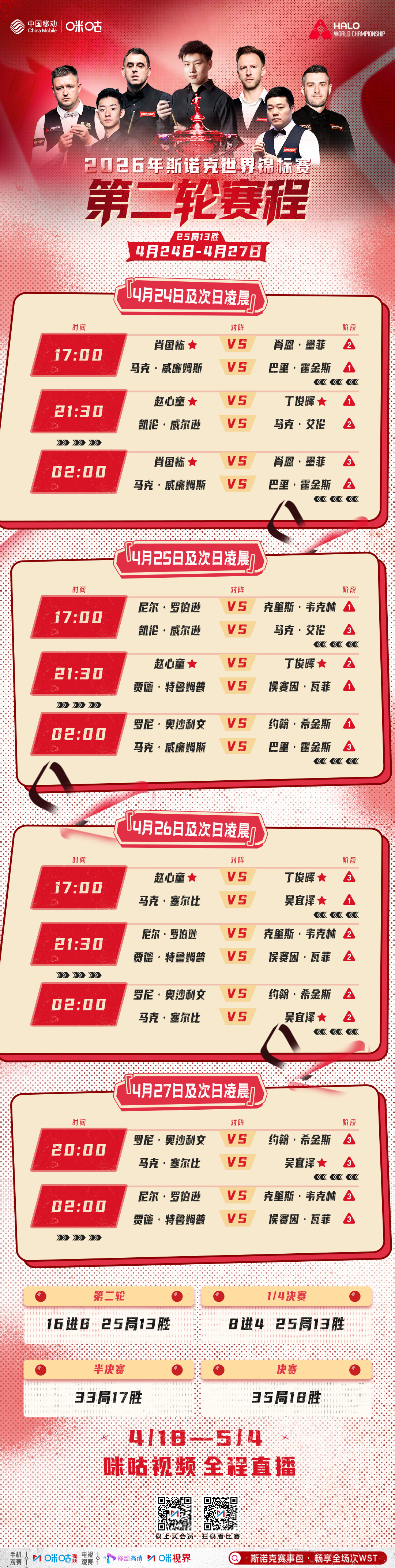 🔥斯诺克世锦赛第二轮赛程🇨🇳中国军团11进 4,冲刺八强✅晚21:30丁俊晖VS赵心童中国德比✅肖国栋、吴宜泽硬仗不断!🔗#看斯诺克上咪咕# 网页链接
