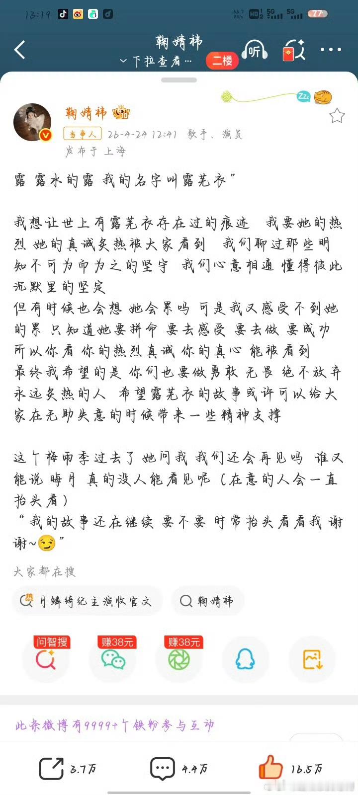 鞠婧祎发长文告别露芜衣🌟荧幕相逢皆是缘分,露芜衣凭独特人设出圈,长文诉说心路历程,认真告别,奔赴全新征程。