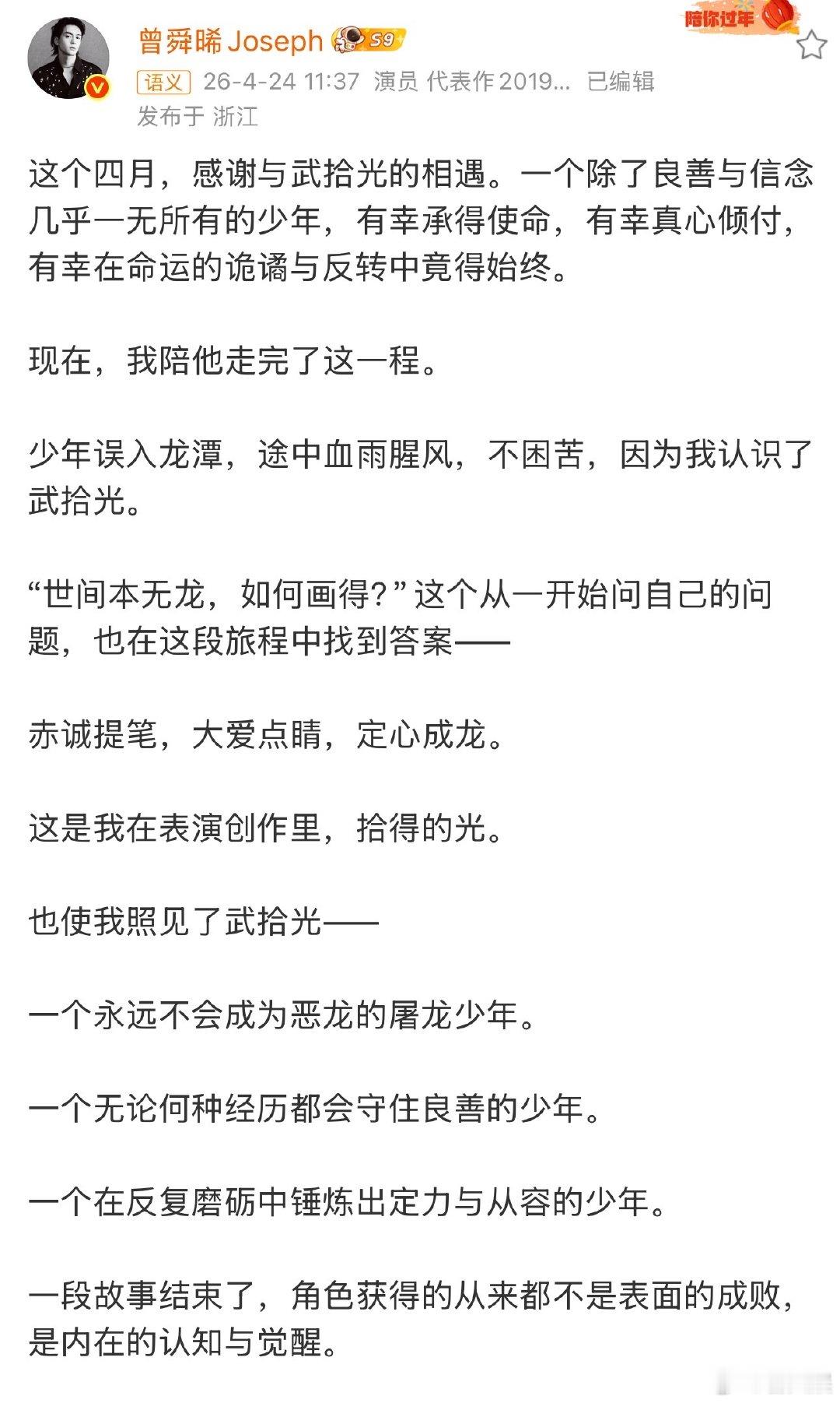 曾舜晞感谢导演曾舜晞武拾光双向成长 曾舜晞收官格局拉满!感谢导演的成全,他演活了永远不变成恶龙的少年,也在角色里完成了自我觉醒与成长。