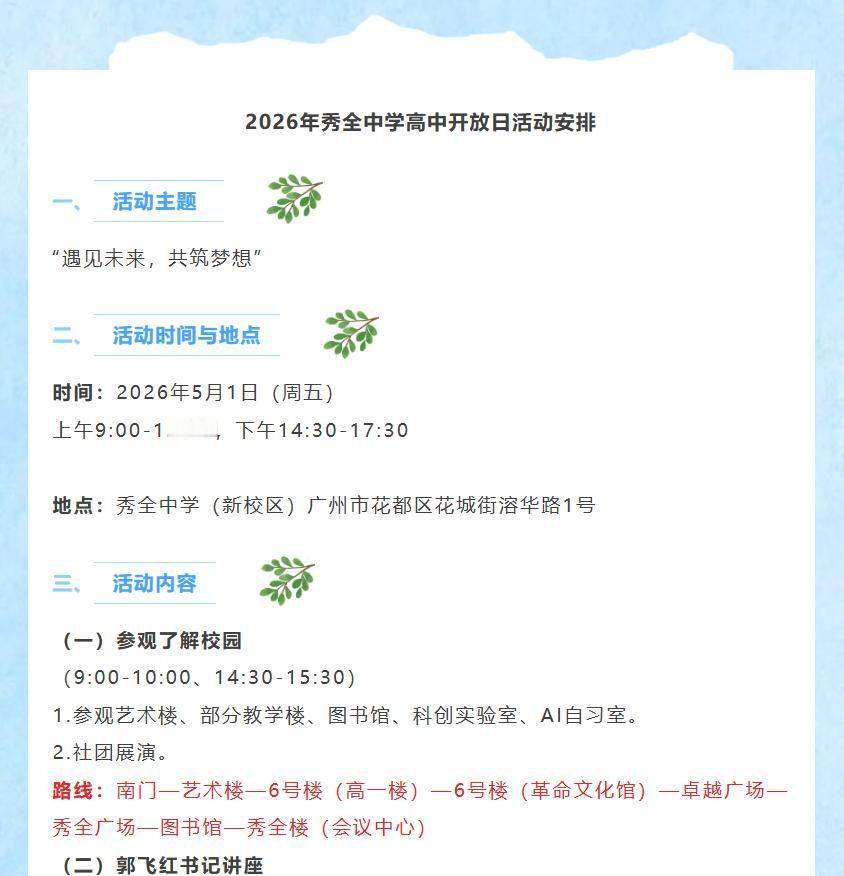 2026年秀全中学高中开放日来了!时间:2026年5月1日(周五) 上午9:00-12:00,下午14:30-17:30,花都区区属龙头,花都区有时间内的家长可以带孩子去看看!