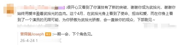 曾舜晞谢谢粉丝们的偏爱曾舜晞对粉丝句句有回应 这次真的被曾舜晞的真诚狠狠拿捏了!曾舜晞在《月鳞绮纪 》收官文下面回应粉丝,谢谢粉丝们的偏爱,当粉丝写 “从深冬寒夜到暖春晴光,143 个日夜的陪伴,谢谢你带来这么好的武拾光”,他就温柔回了句 “谢谢你的守护”;粉丝夸他这次演技有突破,说在他身上看到了演员的无限可能,他认认真真接了 “一期一会,下个角色见”!曾舜晞认认真真把每一份心意都放在心上,连粉丝的小约定都乖乖回应,这种把粉丝的偏爱当回事、句句都有回应的感觉太让人感动了!(cr:网络)