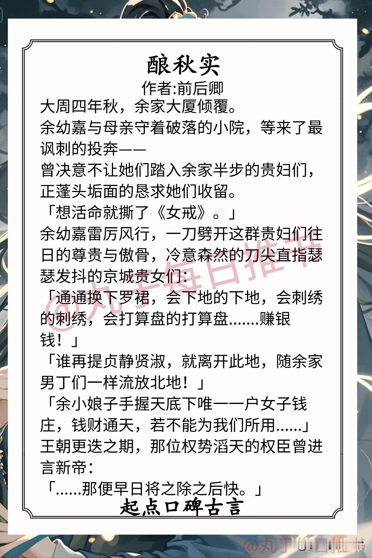[彩虹]近期起点口碑古言合集[送自己一朵花] 1.《引朱鸾》作者:青铜穗(杀伐果断郡主vs傲娇忠犬小王爷,复仇,朝堂权谋,女帝之路) 2.《折金钗》作者:叶杨岚(将门之女vs国公世子,重生,反套路宅斗,家族觉醒,轻喜向) 3.《惊蛰无人生还》作者:时音(聪慧女主vs剑道高手,强强,携手悬探案,悬疑江湖风) 4.《市井娇厨》作者:茶暖(能干小厨娘vs开封府巡使,美食日常,汴京市井生活,) 5.《恶燕》作者:坠欢可拾(野心勃勃女主vs病弱腹黑男主,强强,朝堂权谋,全员恶人) 6.《食在大梁》作者:舒洁(全能小农女vs阴郁王爷,穿越,美食致富,经商之路) 7.《娇华》作者:糖水菠萝(高门贵女vs俊美公子,重生,家国天下,热血女强爽文) 8.《酿秋实》作者:前后卿(商户女vs新贵,穿越,搞事业,打脸虐渣,苏爽文) 9.《大清佳人》作者:尤妮丝(躺平后妃vs勤政帝王,穿越,后宫日常,轻松向)小说 推文