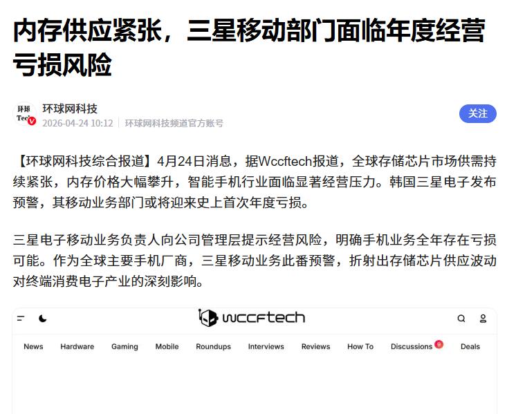内存威胁下,三星手机部门或将亏损 据媒体报道,由于内存价格大幅攀升,智能手机行业正面临史无前例的成本飙升潮。 在这样的背景下,三星手机部门也向管理层报告了经营风险。其表示:受内存波动影响,手机部门全年存在亏损可能。 值得深思的是,不知道三星面临的成本问题,是否会成为整个手机行业的共性问题?未来国内外是否会有更多的厂商,因内存问题而经受定价考验?