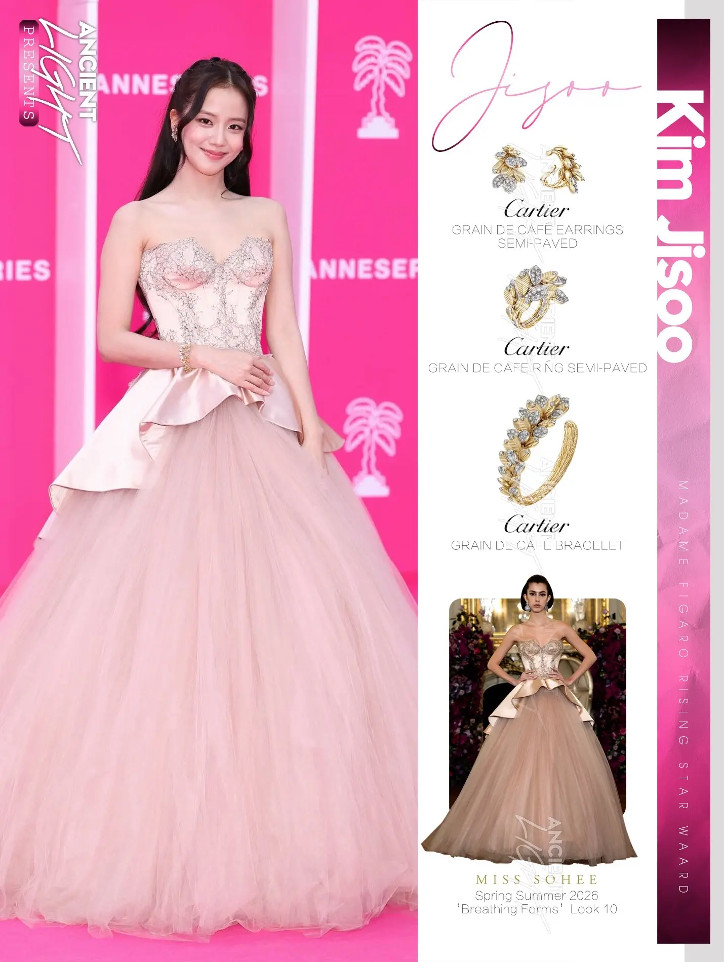 金智秀·公主闪耀戛纳,获此殊荣的亚洲艺人 金智秀凭借主演剧集《月刊男友》的出色表现,荣获戛纳国际电视剧节“Madame Figaro新星奖,这是亚洲艺人首次获此殊荣。 红毯与造型亮点:她身着韩国设计师2026春夏香槟粉高级定制礼服,搭配珠宝。以公主编发造型亮相粉毯。犹如古典油画中走出的公主一般。