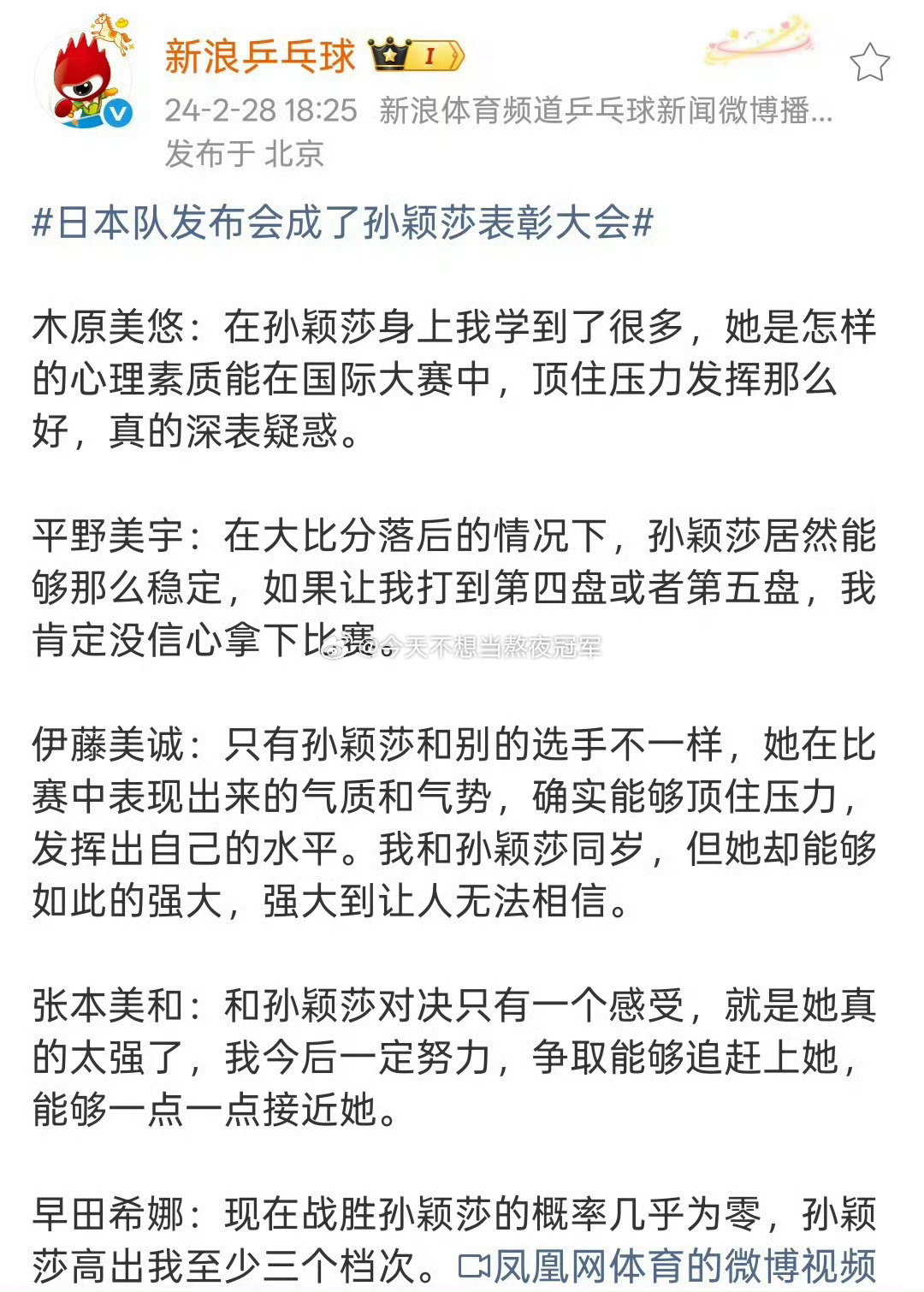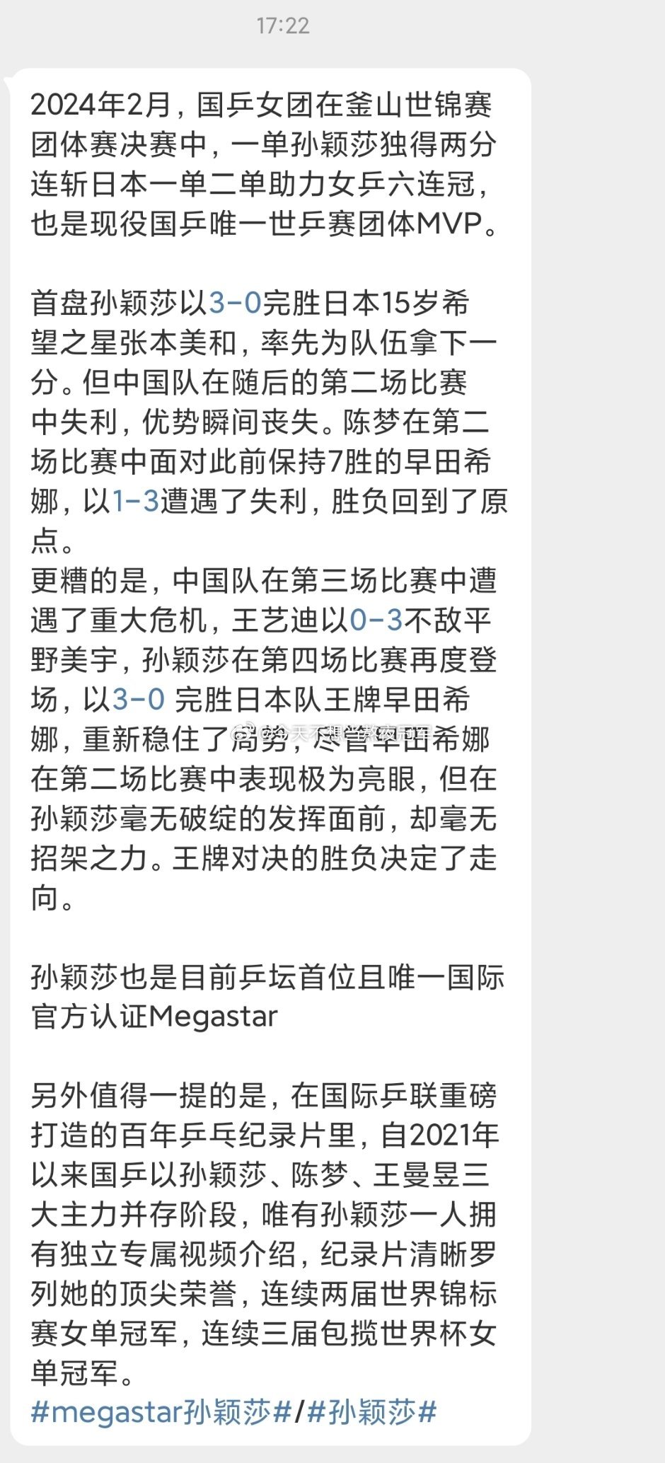 另外莎莎还是国际乒联认证Megastar➕纪录片里独一份的个人章节孙颖莎结束封训孙颖莎说当世界第一veryhappy