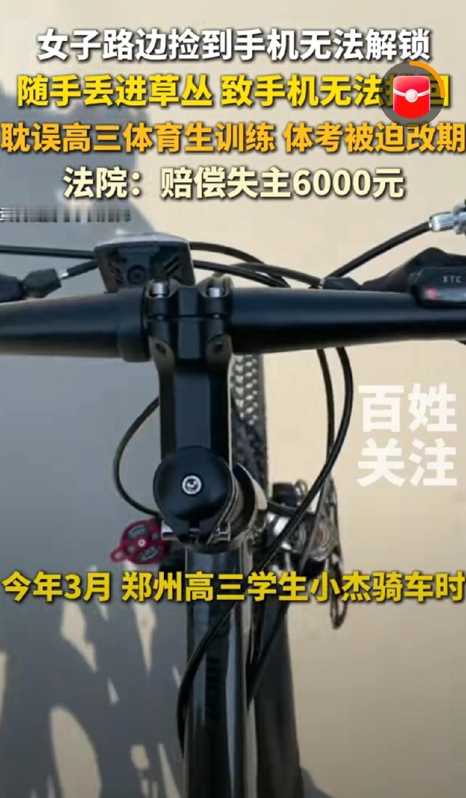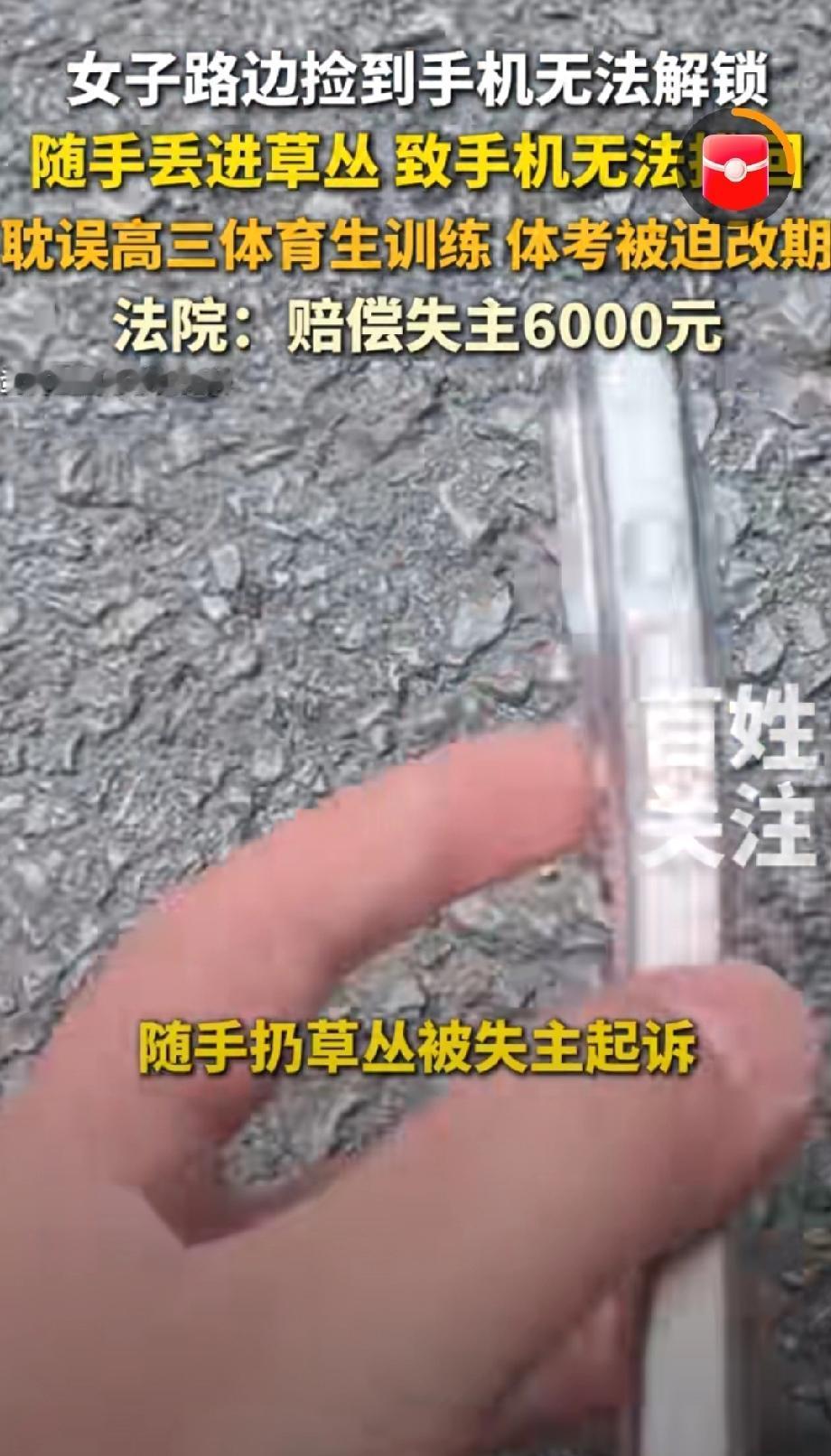 冤不冤!河南郑州,一女子在路上捡到一部手机,试了试,有密码打不开。二话不说,随手扔进了路边草丛。她觉得自己没偷没抢,“用不了就扔了呗,有啥大不了?”万万没想到,就因为这个“随手一扔”,最后法院判她赔人家6000块钱!到了法庭上,改口说“手机发烫怕爆炸”,想甩锅。这到底是怎么回事? 小杰(化名)是郑州一名高三体育生,妈妈花了7700多块钱给他买了一部新手机。 平时训练、查体考信息、存训练计划,全都靠它,手机里东西非常重要。 今年3月的一个晚上,小杰骑车时不注意,手机从口袋里滑了出去。等他发现不对劲,赶紧往回找,再打自己的电话,已经关机了。孩子急得满头大汗,马上报警。 民警调出沿路监控,一眼就锁定了捡手机的人——元某 民警很快联系上元某。元某倒也直接,承认自己捡了手机,但她说了这么一句话:“手机有密码,我解不开,留着也没用,就随手扔路边草丛里了。” 更麻烦的是,她扔的那个地方正好是监控死角,民警翻来覆去找了好几遍,手机就像人间蒸发一样,再也找不回来了。 手机丢了,小杰的麻烦大了。不光7700多块的手机没了,里面存的训练计划、体考报名资料全丢了,他还不得不临时改期参加体考,训练被打乱,压力特别大。 小杰的家人找元某协商赔偿,元某不愿意。没办法,他们只好把元某告上法院,要求她赔偿手机钱和其他损失一共9000块。 到了法庭上,元某的口气突然变了。她改口说:“我捡到手机的时候,手机发烫,电池鼓包,我怕爆炸才扔掉的。” 可是她拿不出任何证据,而且这套说法跟之前对民警说的“解不开密码才扔的”完全对不上。 法院按照电子设备最低3年折旧的标准算了一下,手机买了8个月,折旧后价值6000元。 最后判决元某赔偿小杰6000元。至于小杰要求的其他间接损失,因为法律上不太好计算,法院没有支持。 有网友可能觉得:“我又没偷没抢,捡到的东西就是我的,我想扔就扔,碍着谁了?” 根据民法典第314条要求捡到别人的东西必须归还,要么及时通知失主来领取,要么送交公安等相关部门,不能自己留着或者随便处理。 大部分普通人都觉得,东西是路上捡到的,不是偷盗得来,自己想扔想丢都无所谓。可法律清清楚楚写明,遗失物品依旧属于他人私人财产。 像元某因解不开密码把手机扔进草丛,是典型的“故意”让手机灭失。她必须为自己的任性行为买单。 你可以不贪图、不占有别人的东西,但绝对不能故意毁掉、随意丢弃。从你捡起那个东西的那一刻起,你就负有了“妥善保管并归还失主”的法定义务 女子只图自己省事,不顾他人损失,最后赔钱打官司,全部都是自己造成的后果。做人做事不能只考虑自己,要有基本分寸和底线。 女子捡到手机解不开密码丢草丛被判赔