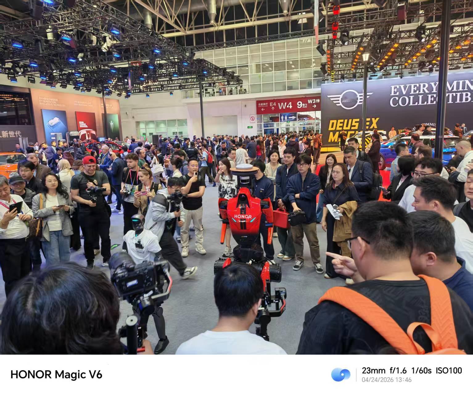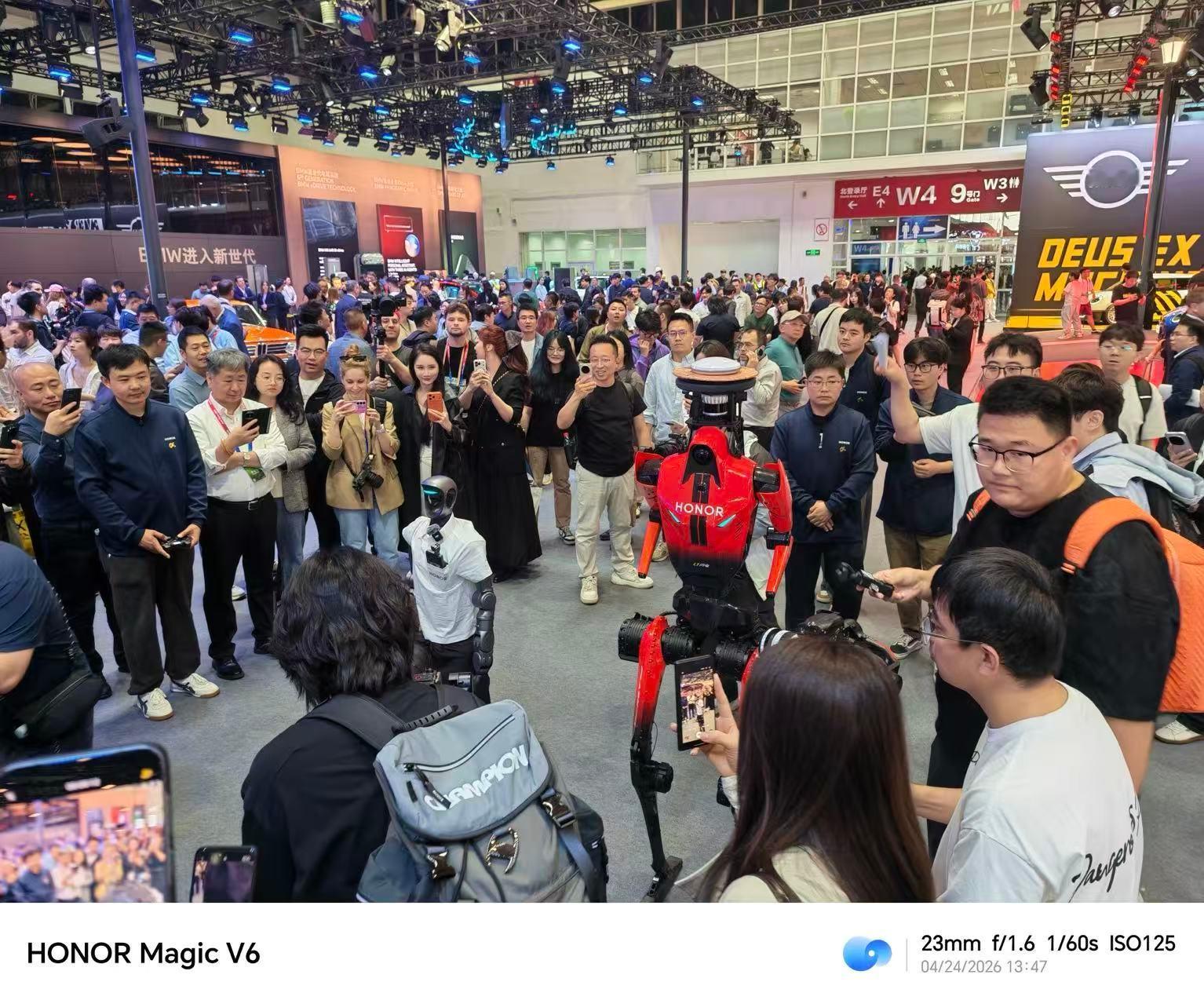荣耀机器人跑完马拉松又来当车模 刚在赛道拼完耐力,转眼就站到车旁摆起专业pose!