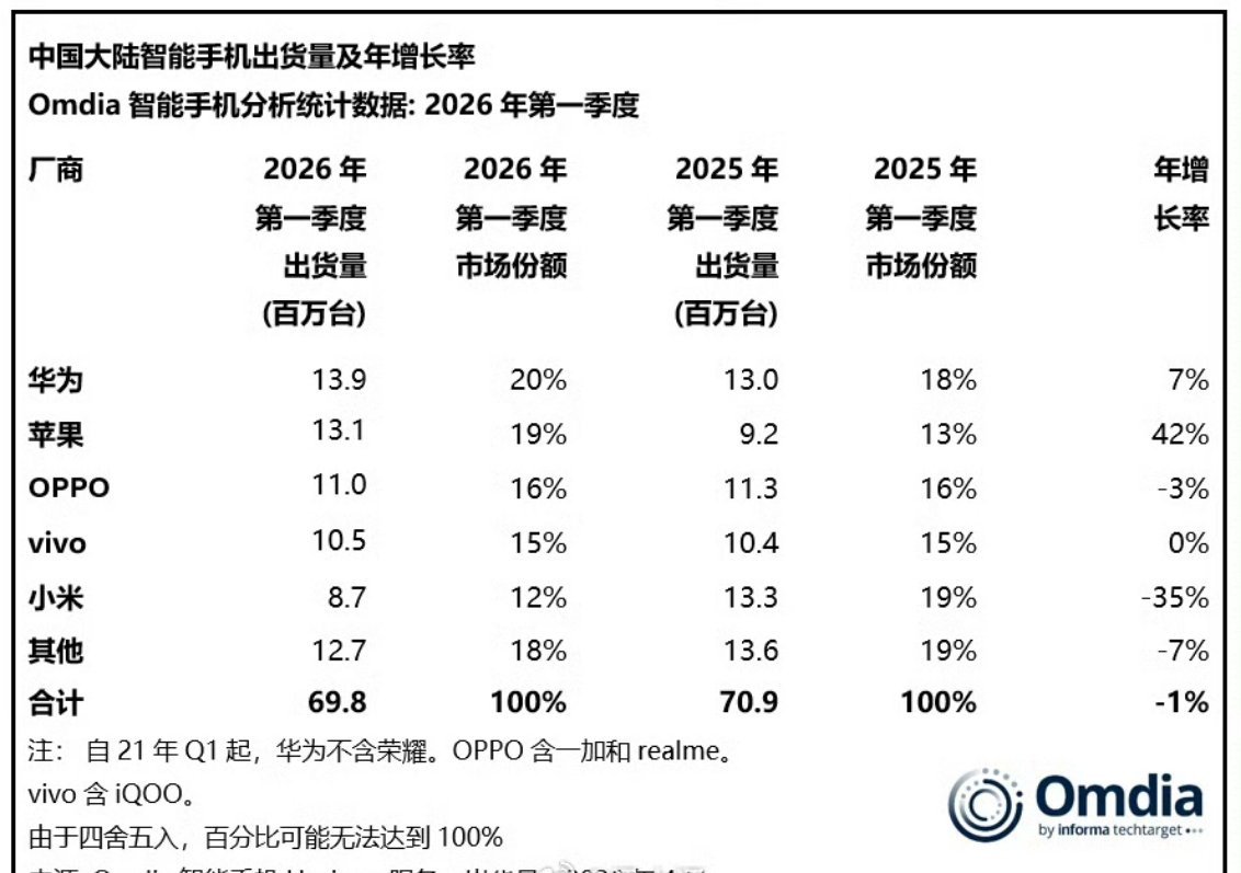 华为夺一季度中国手机出货量第一2026年Q1华为以1390万台出货量、20%份额重回国内第一,在存储芯片涨价、大盘同比下滑的背景下逆势增长。中端机型走量、折叠屏持续领先、渠道与库存管理较稳,成为拉动增长的关键。但高端机型产能仍受限,若完全释放或可进一步提升份额。整体来看,这波回升是产品力与渠道协同的结果,仍需持续验证长期稳定性。华为手机华为5g折叠屏手机华为 手机市场