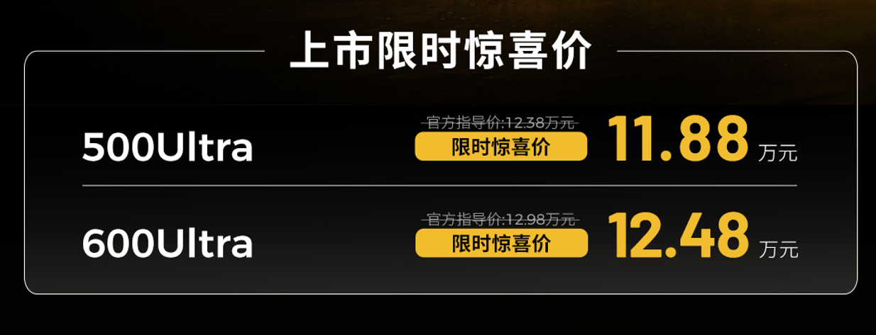 500 Ultra与600 Ultra两个版本的主要差异在于电池与续航,前者搭载56.2kWh国轩高科电芯,CLTC续航500公里;后者采用67.1kWh宁德时代电芯,CLTC续航提升至600公里。