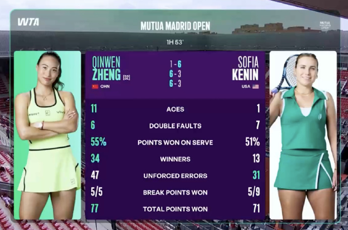 全场比赛用时1小时53分钟,郑钦文发出11个ACE球和6个双误,发球得分率55%,制胜分34个,非受迫性失误47个,获得5次破发机会全部兑现,总得分77分。