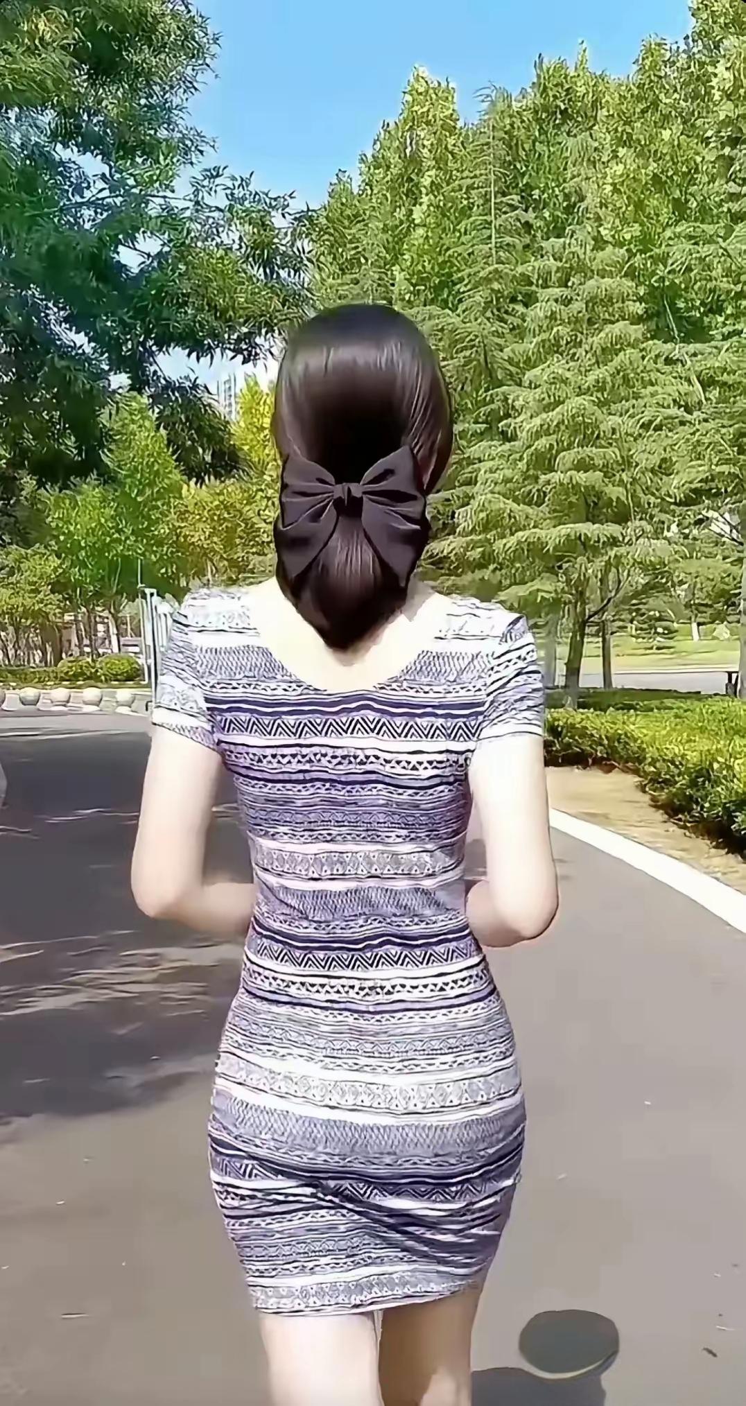 夏日清新穿搭,黑白条纹连衣裙,搭配大蝴蝶结发饰,漫步在绿意盎然的公园里。